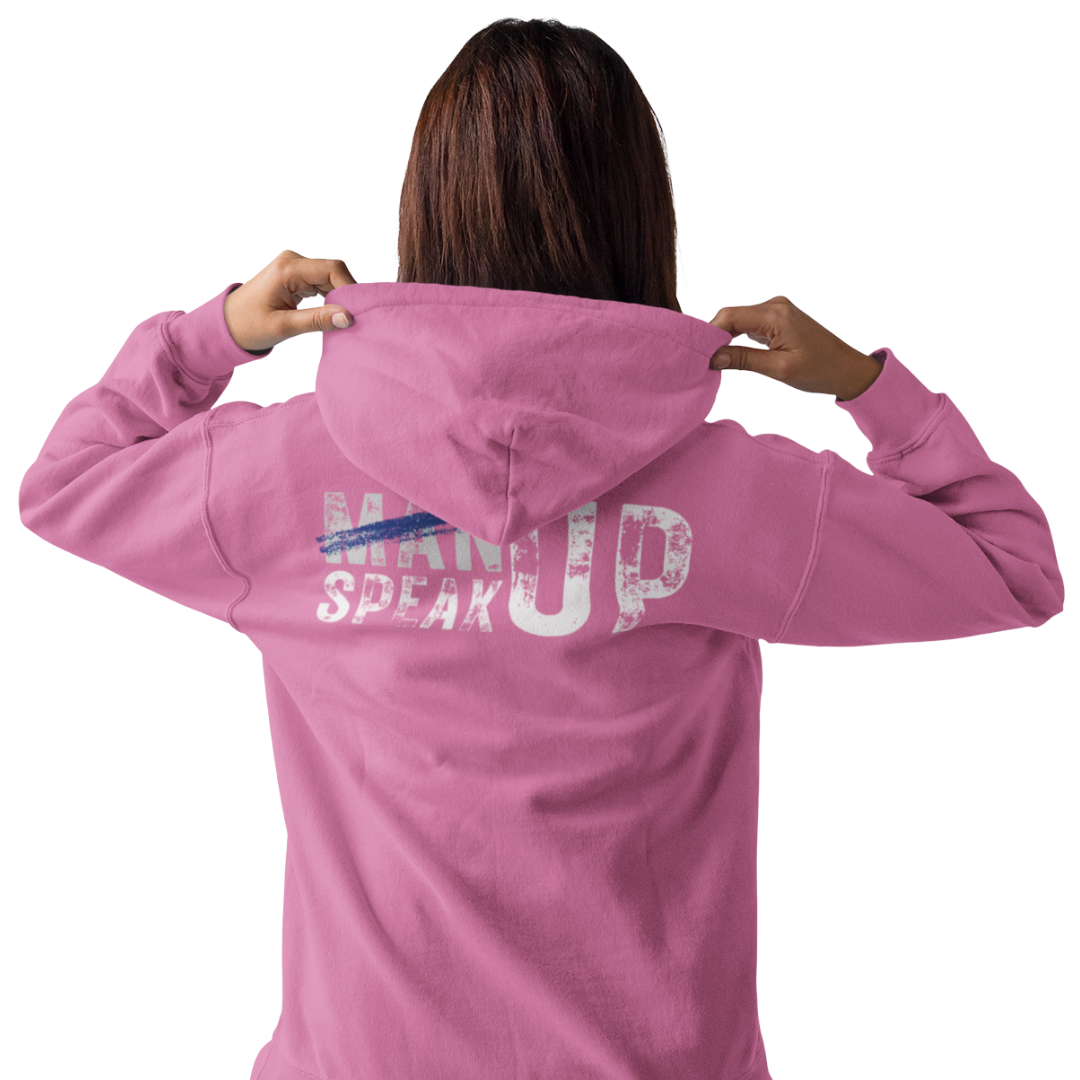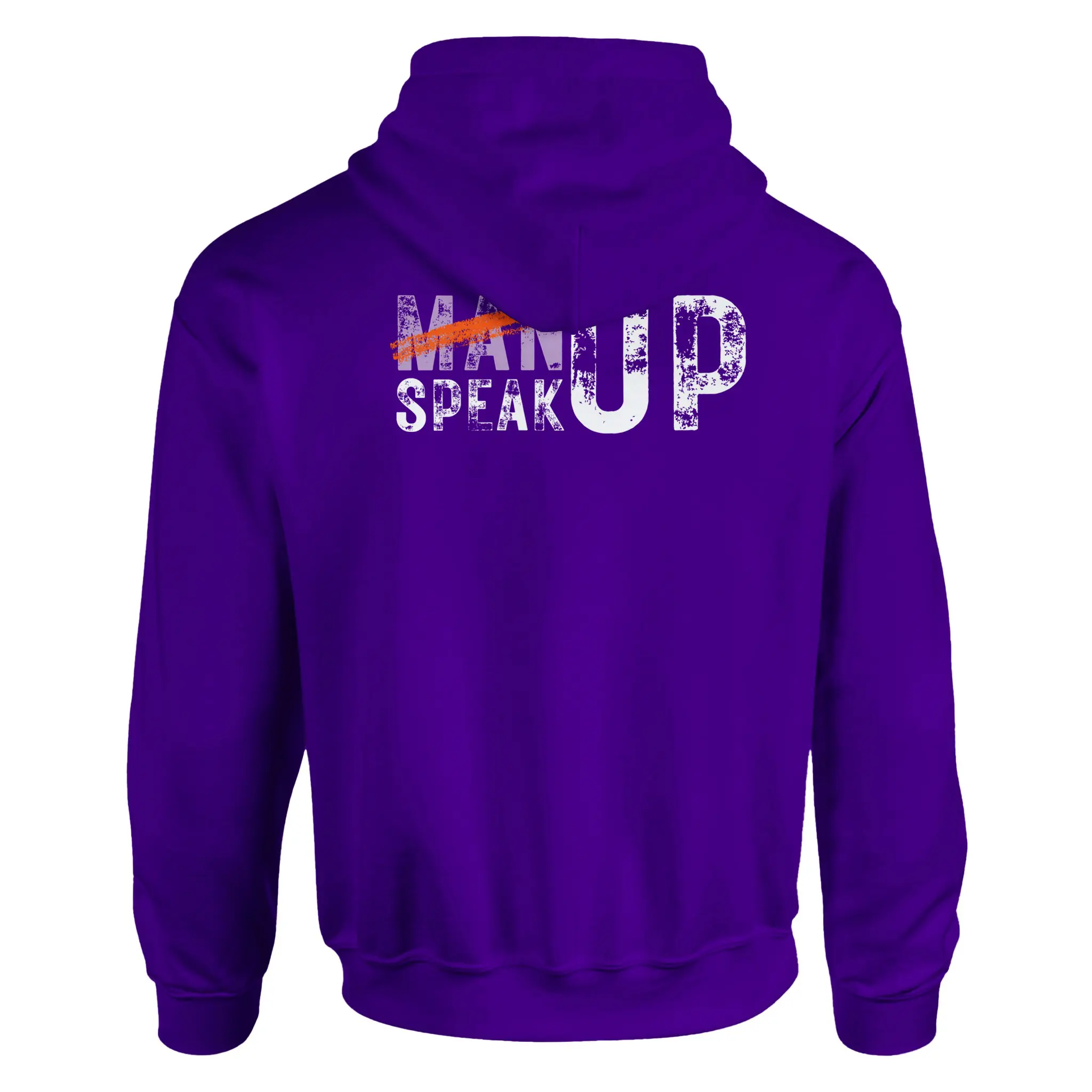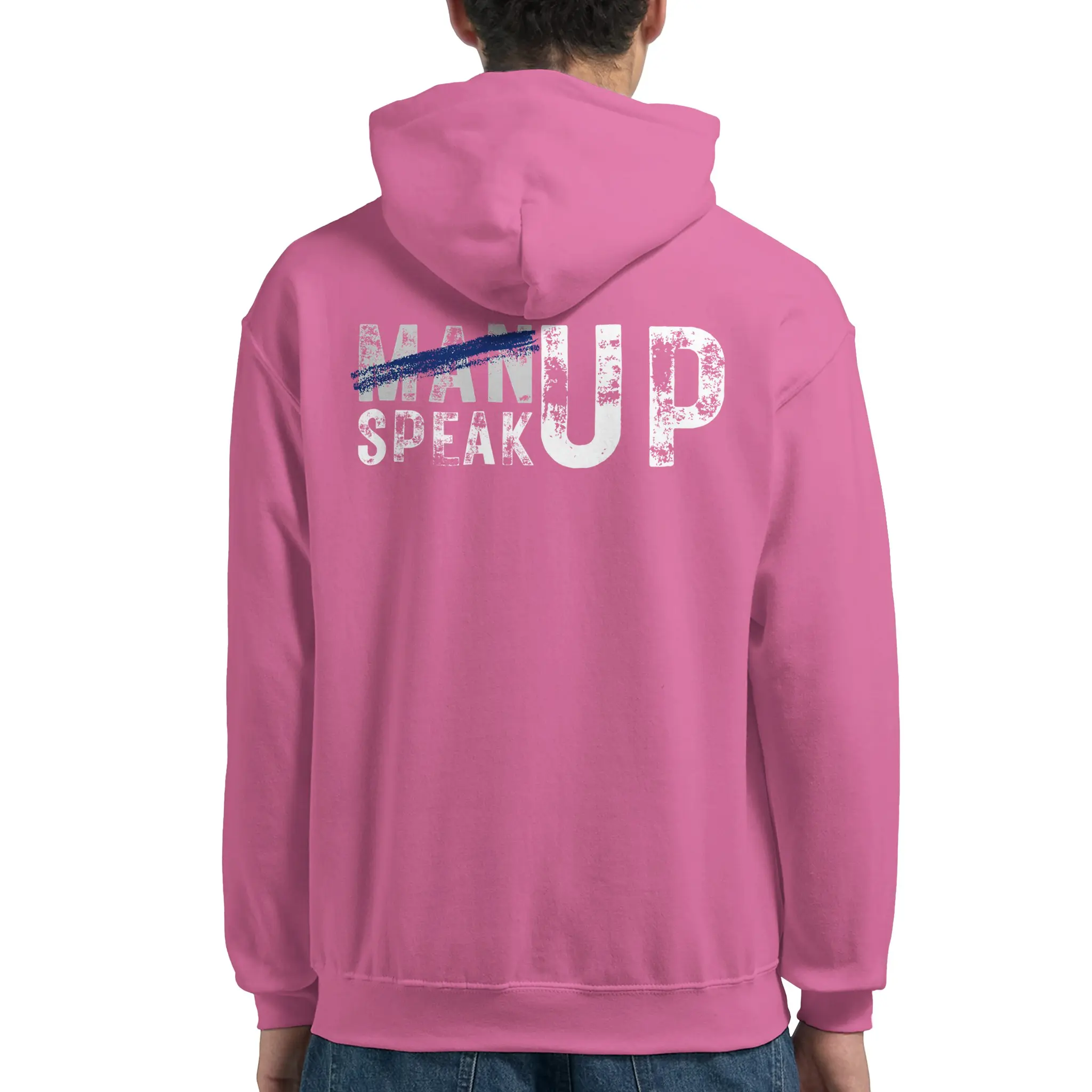 The Speak Up 3.0 Hoodie features a powerful, full-back distressed graphic that clearly and unequivocally rejects the harmful pressure to suppress emotions. This is a visible, non-negotiable stance against the phrase “Man Up” and a direct call for emotional honesty.