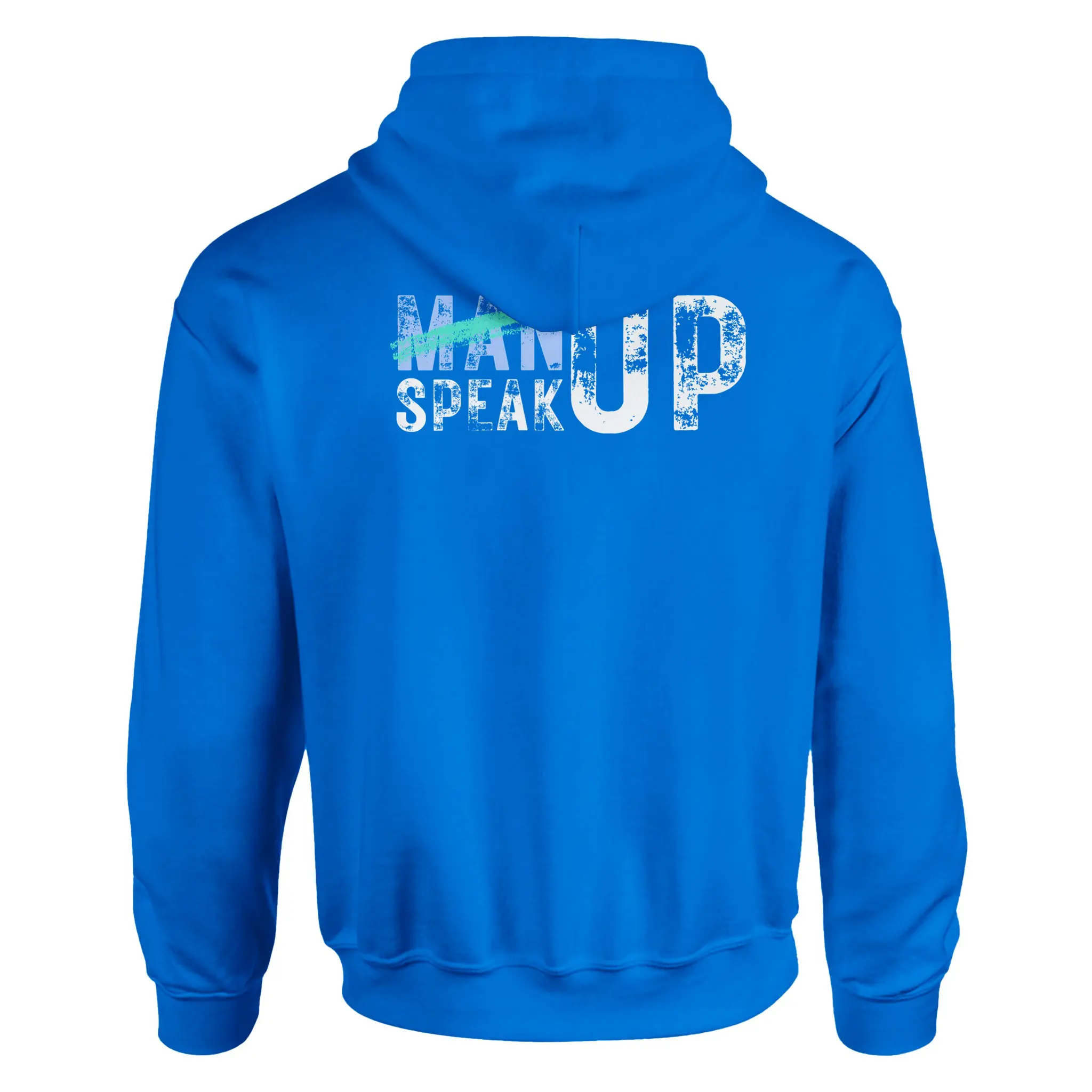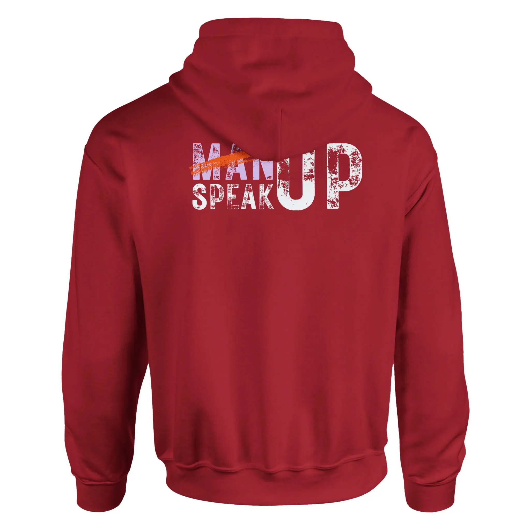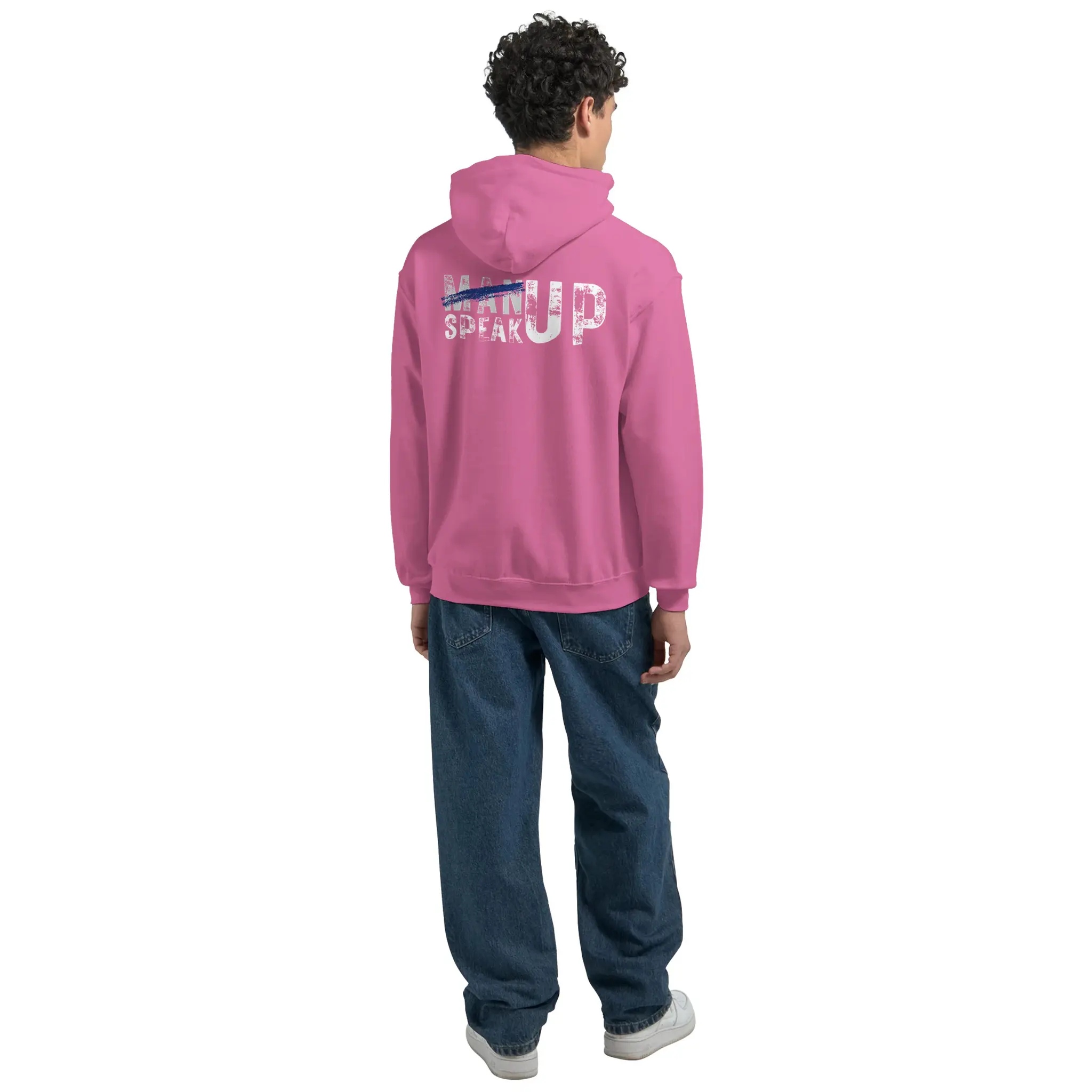 The Speak Up 3.0 Hoodie features a powerful, full-back distressed graphic that clearly and unequivocally rejects the harmful pressure to suppress emotions. This is a visible, non-negotiable stance against the phrase “Man Up” and a direct call for emotional honesty.