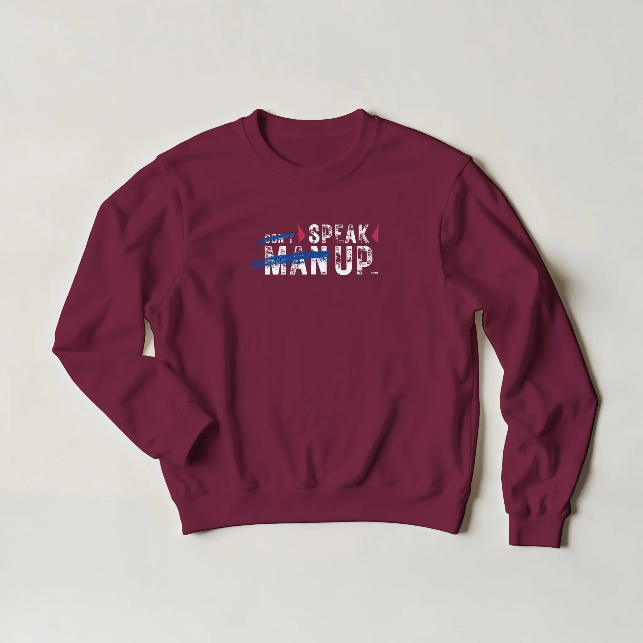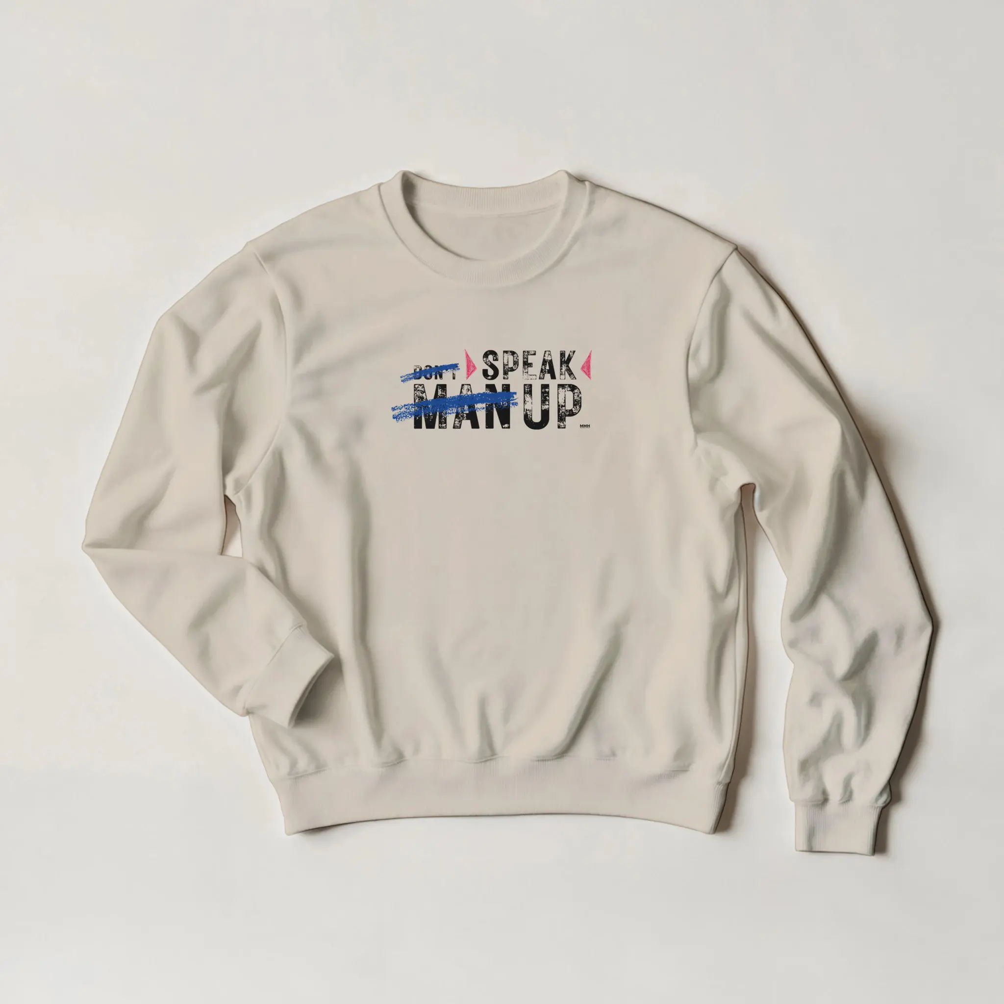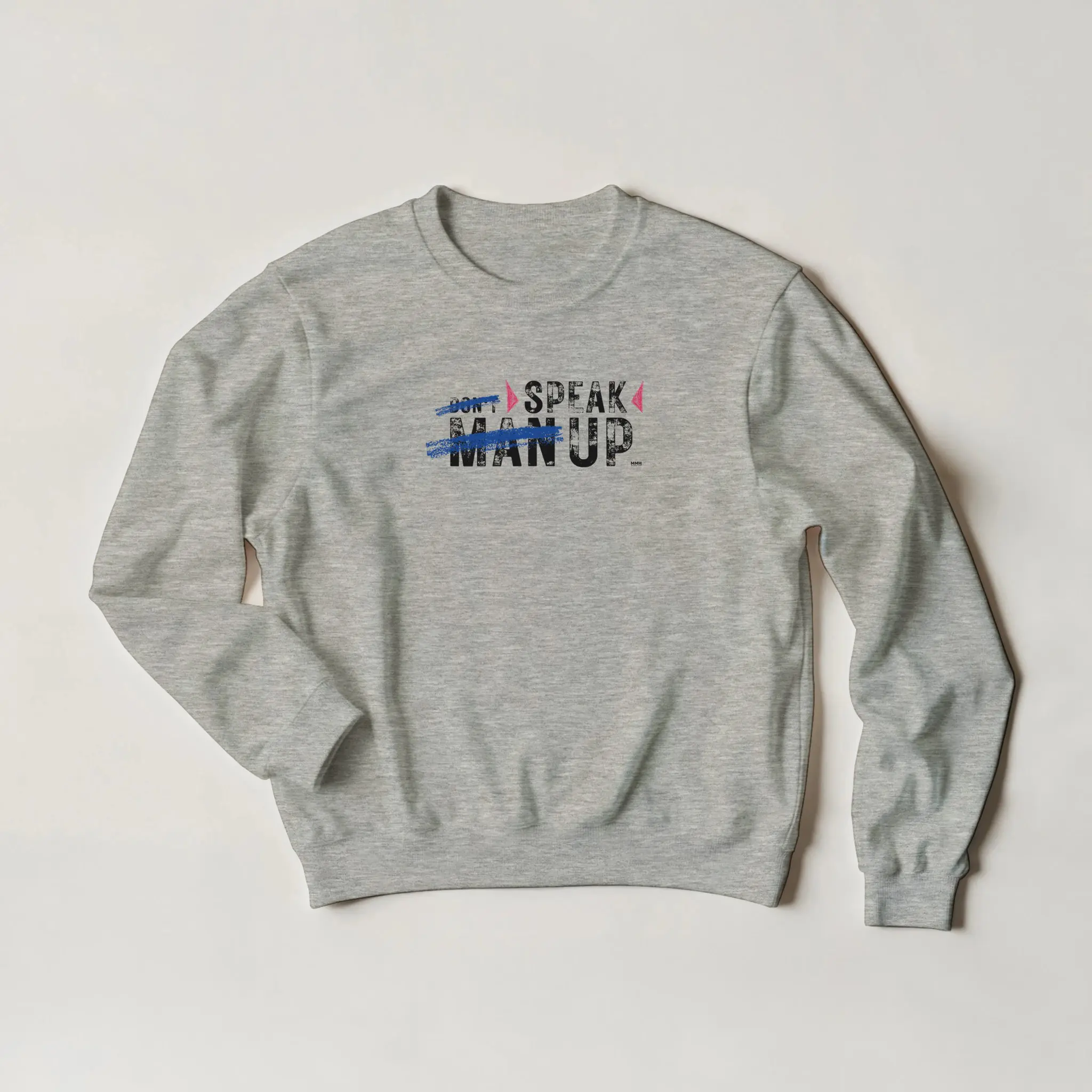 The front of this sweatshirt features the striking phrase “Don’t ‘Man Up’ – Speak Up.” with “Man Up” crossed out, symbolizing the rejection of harmful stereotypes that discourage emotional expression.