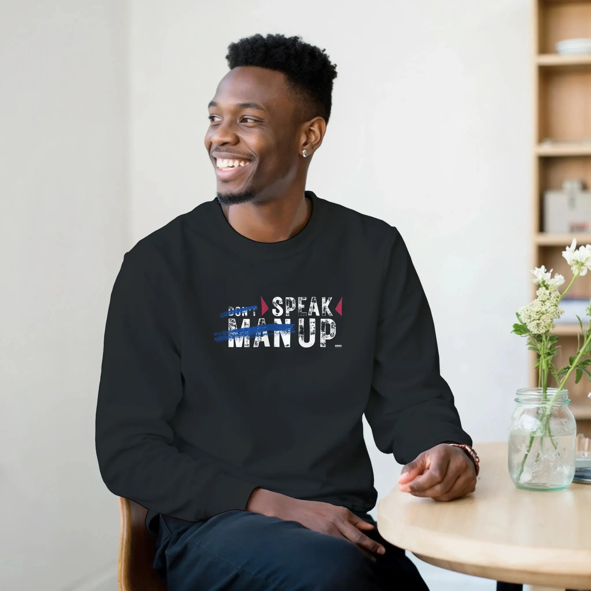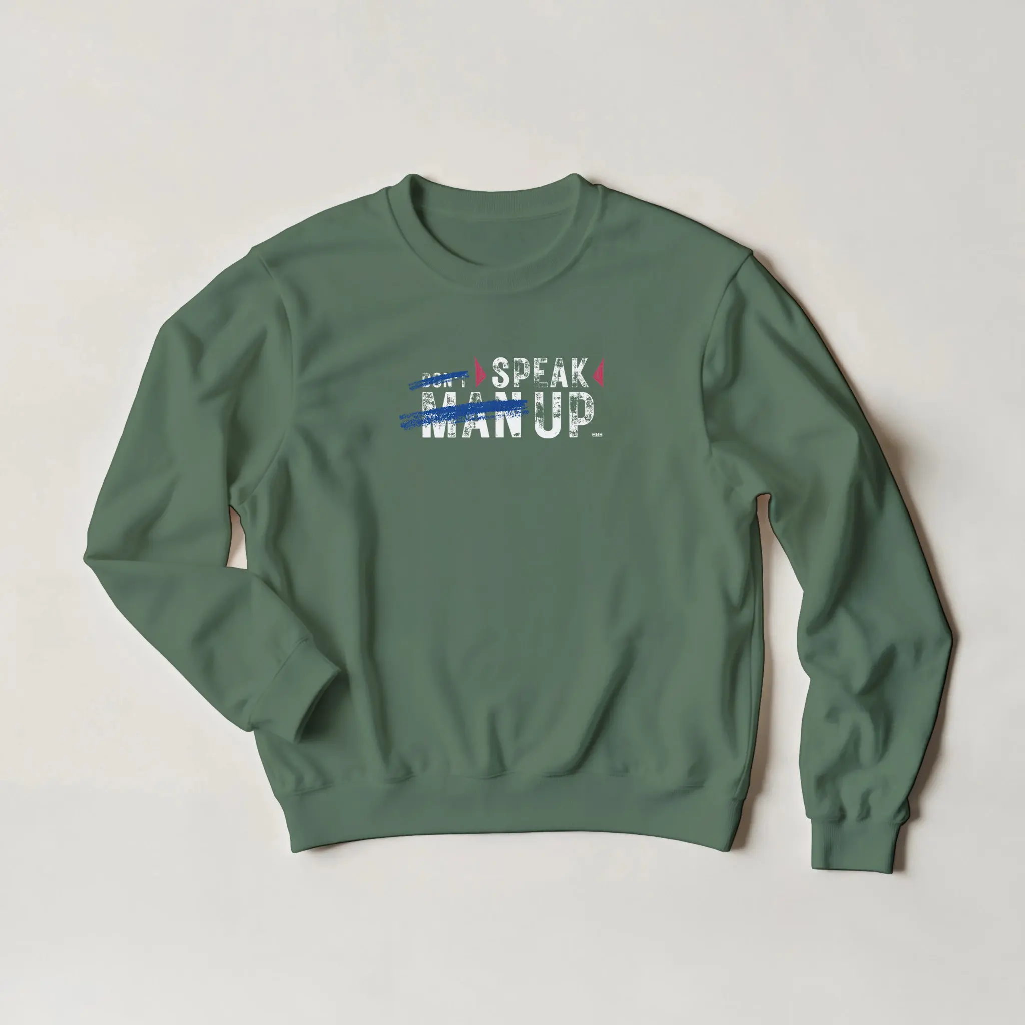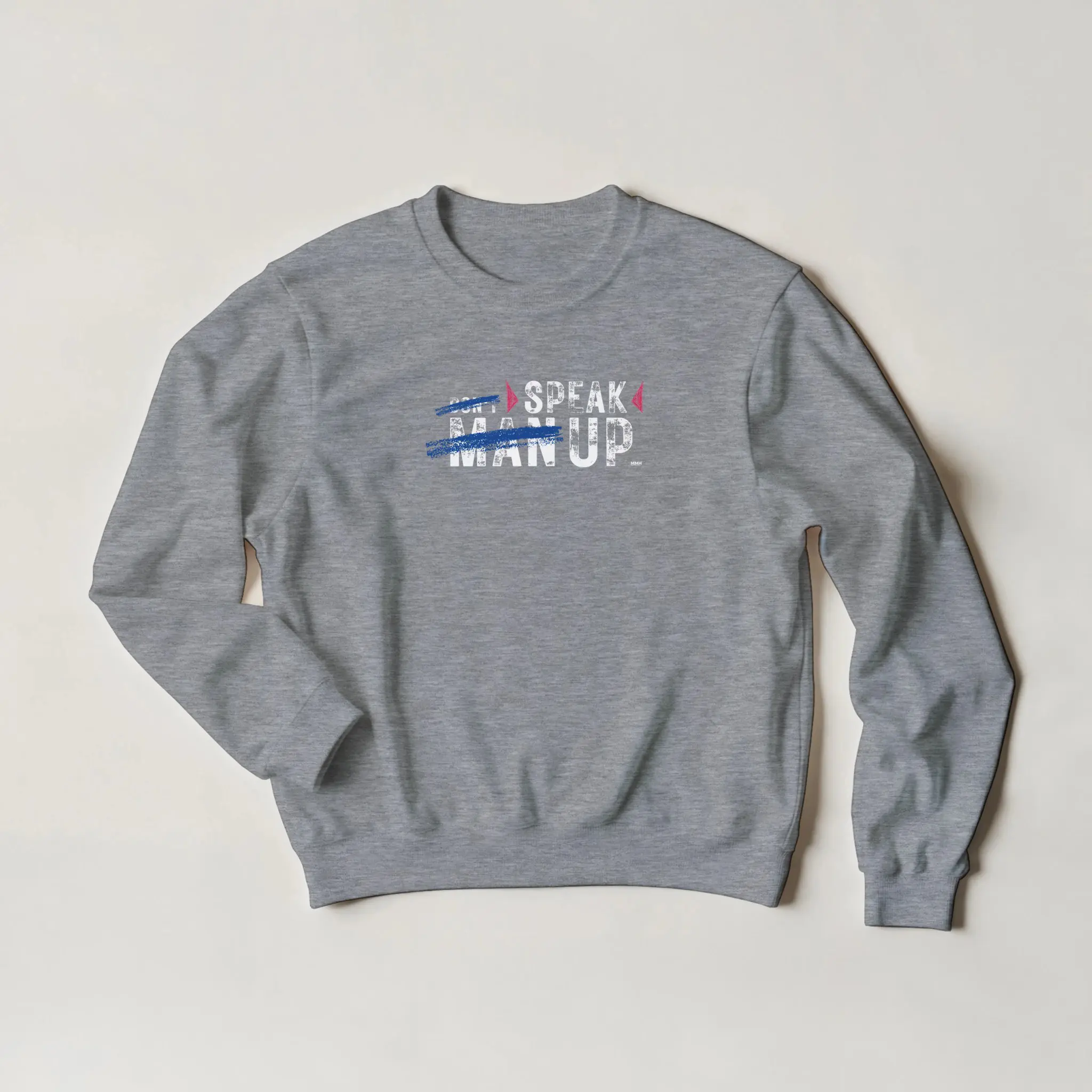 The front of this sweatshirt features the striking phrase “Don’t ‘Man Up’ – Speak Up.” with “Man Up” crossed out, symbolizing the rejection of harmful stereotypes that discourage emotional expression.