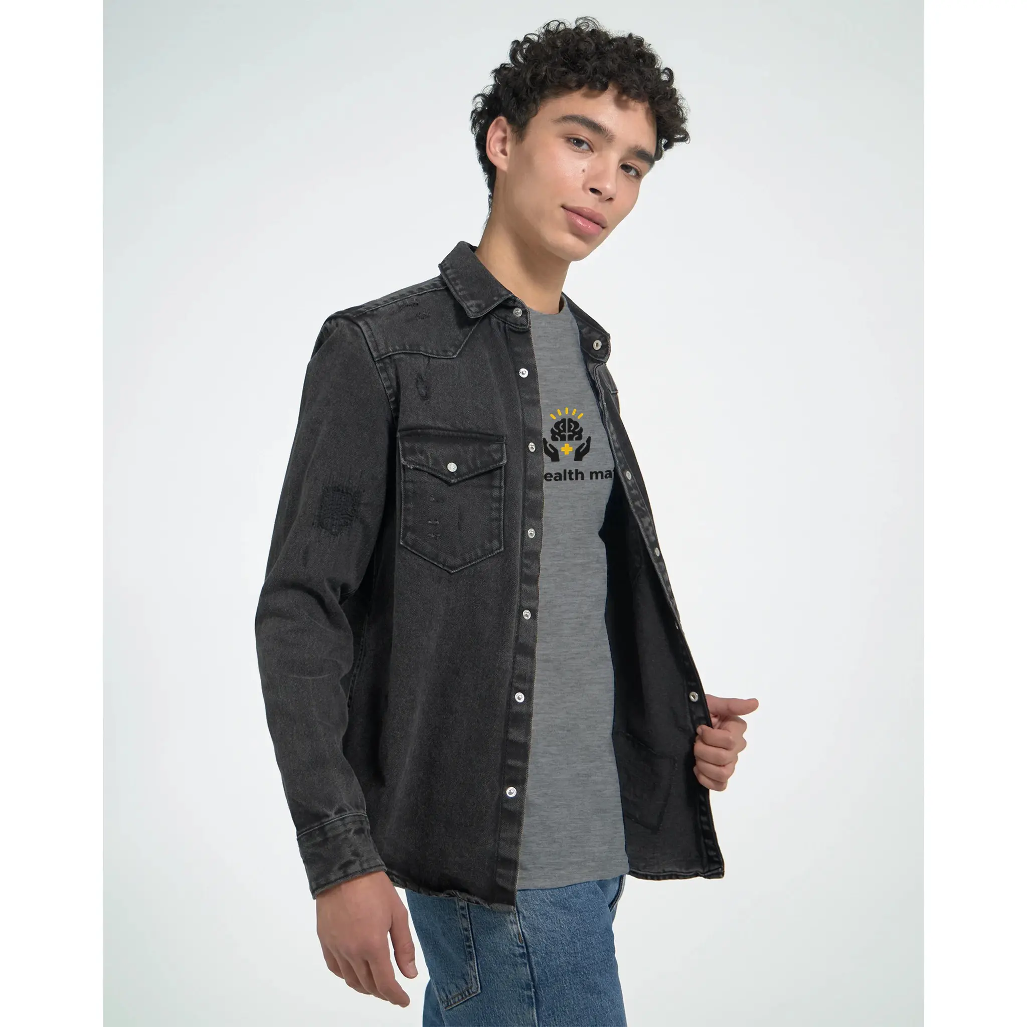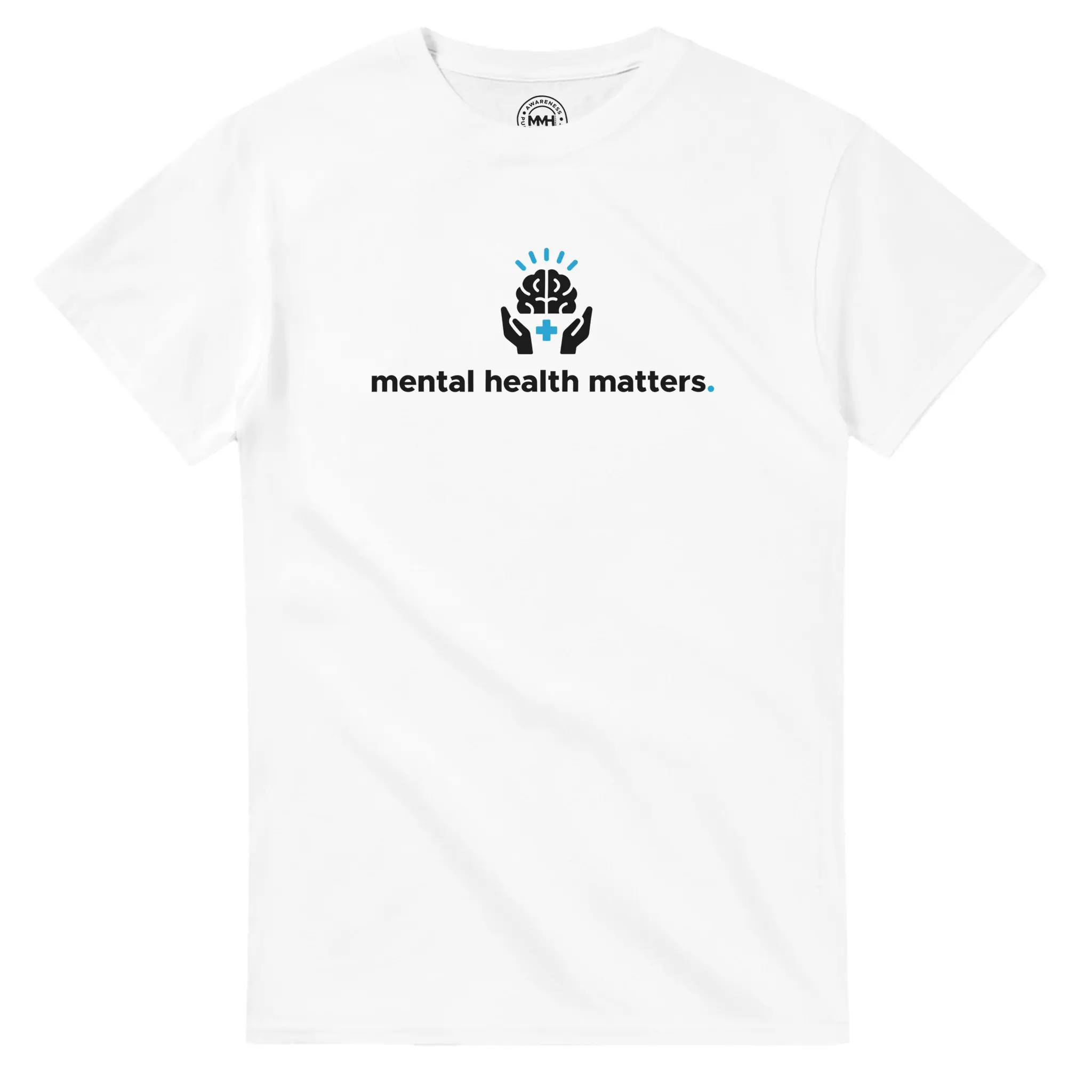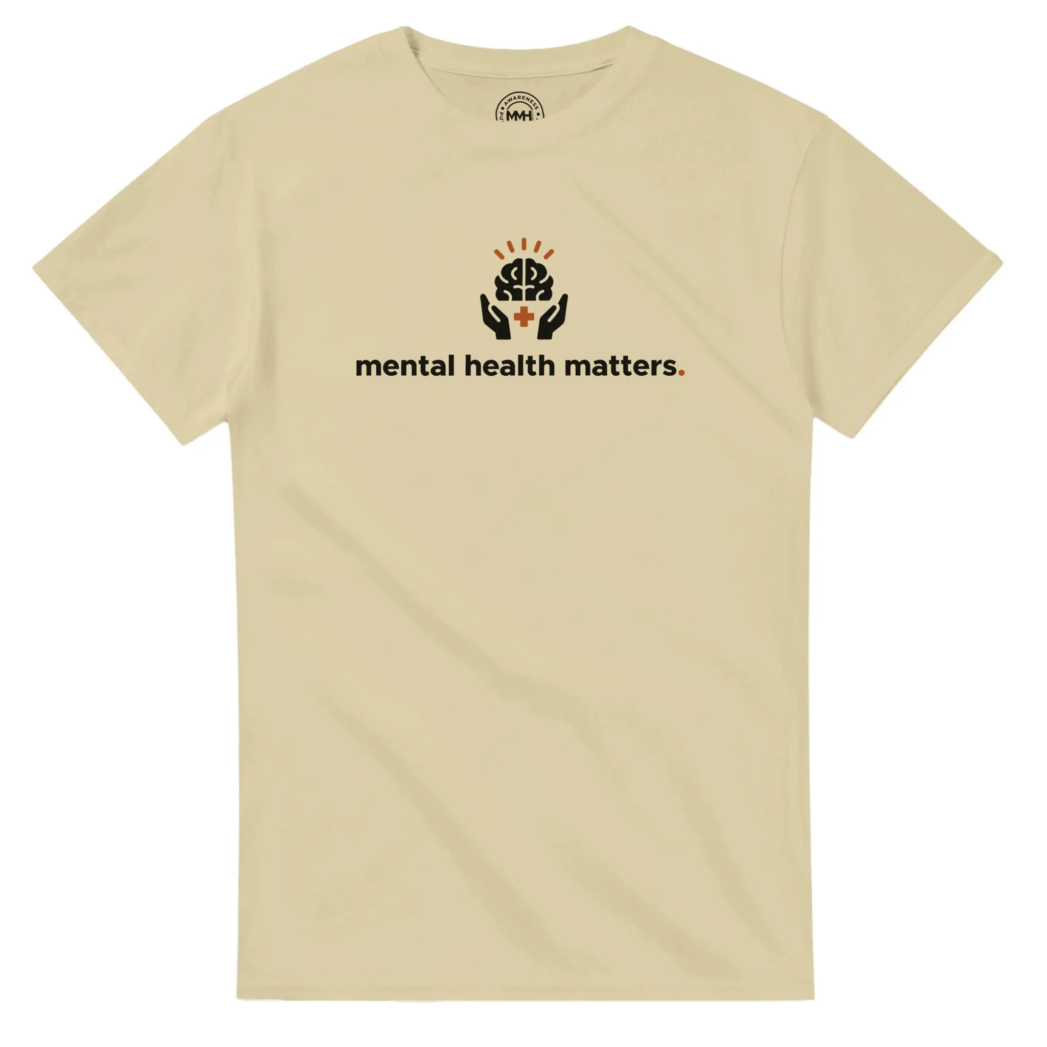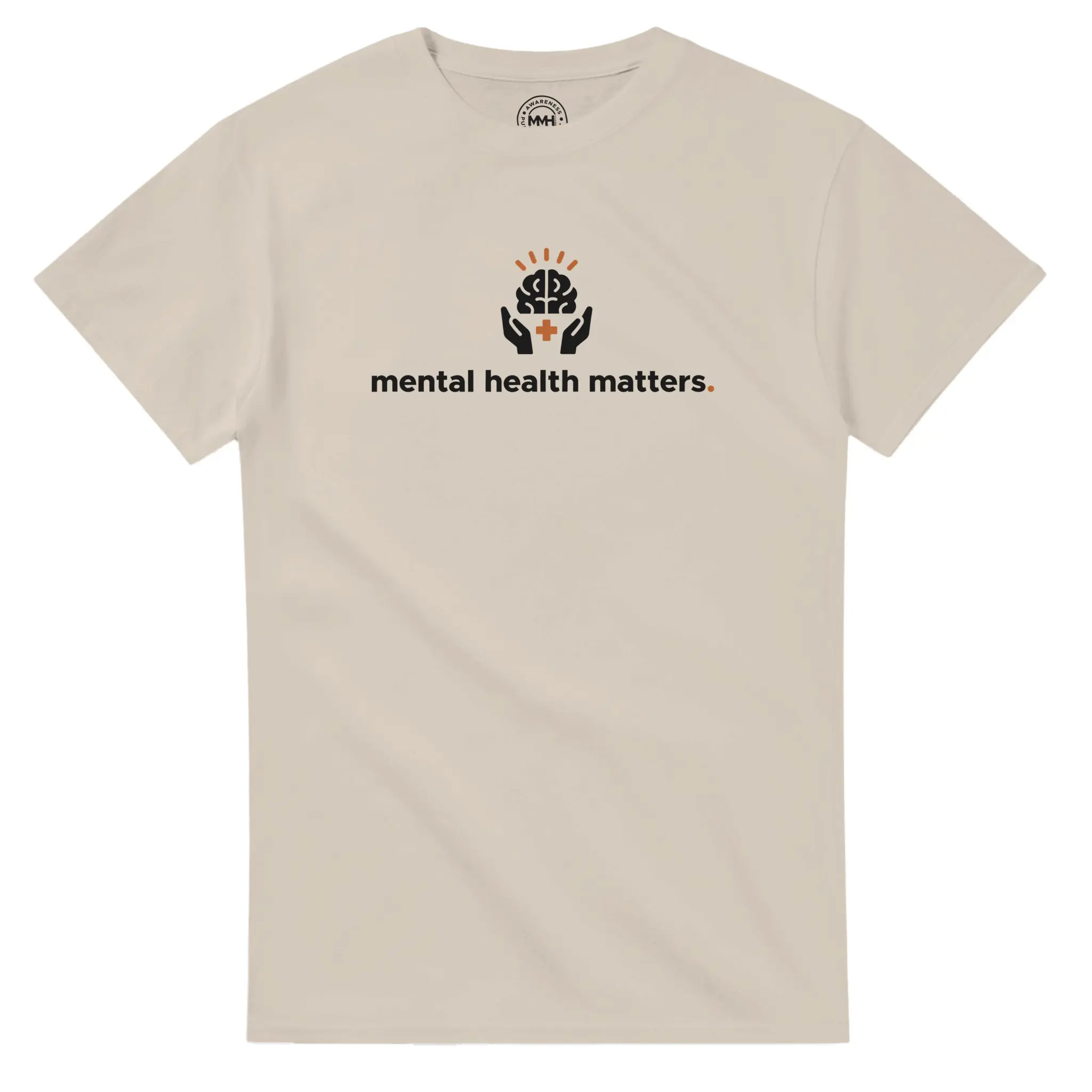 - Front Print: Large “Mental Health Matters” text with the Brain & Hands icon. Bold and centred.