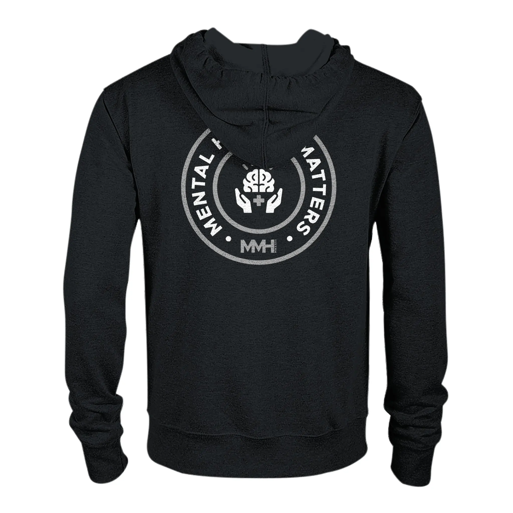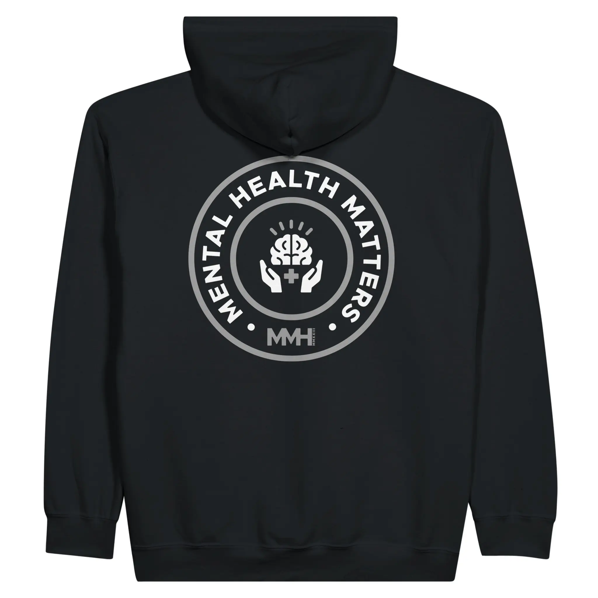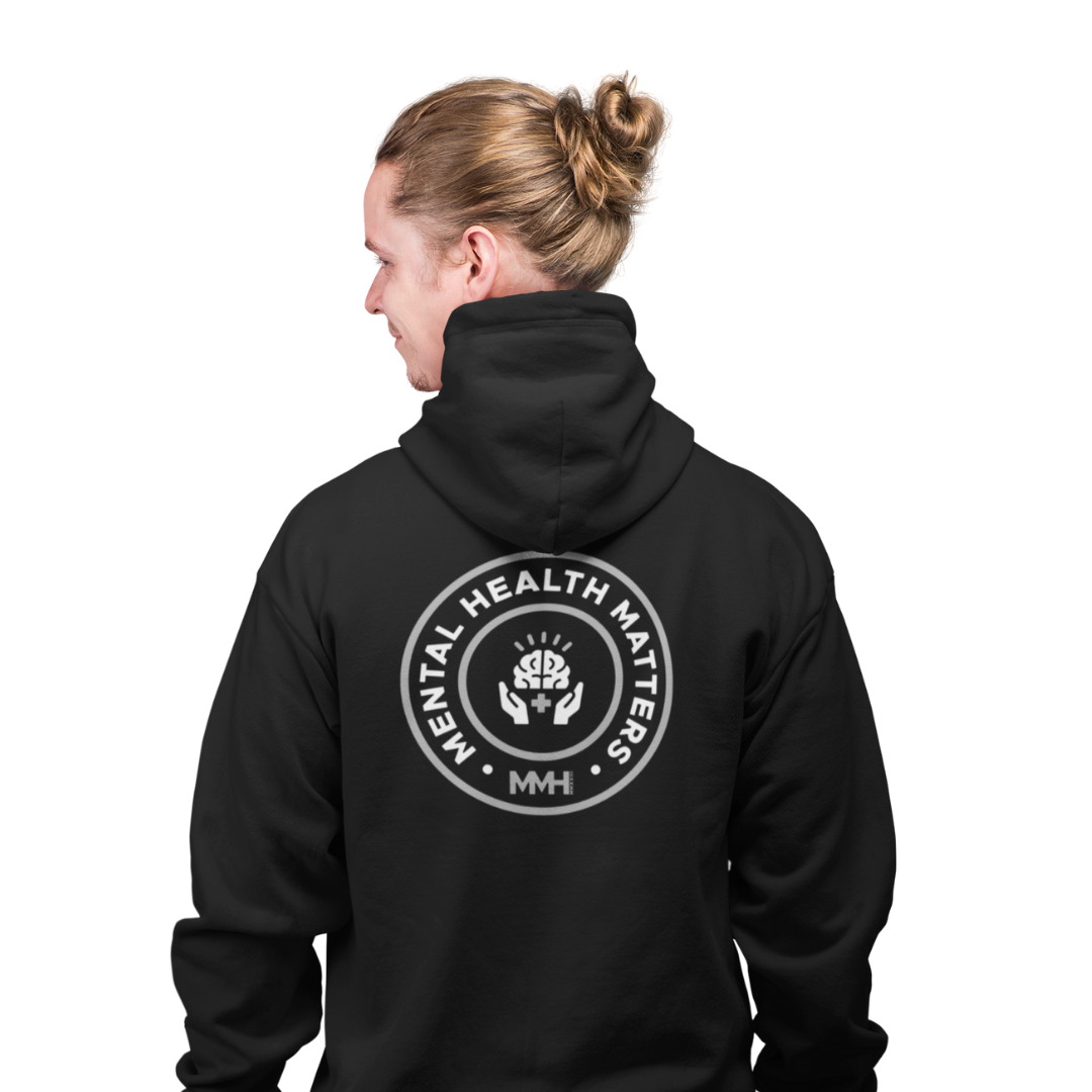 Features the bold Mental Health Matters emblem on the back with a strong central icon and circular message design. The front chest displays the Awareness • Purpose • Impact – MMH logo, giving the hoodie a clean, balanced look with meaning front and back.