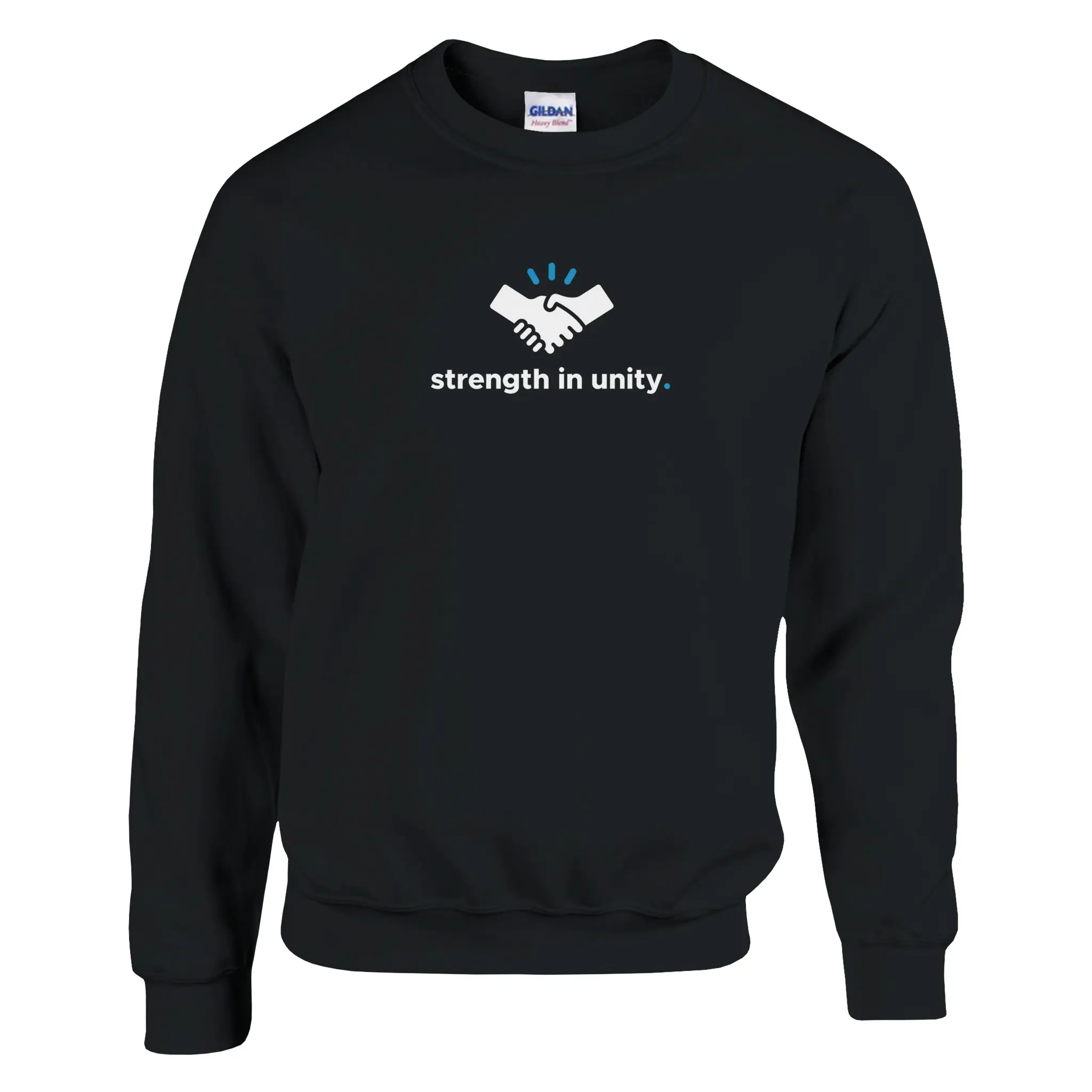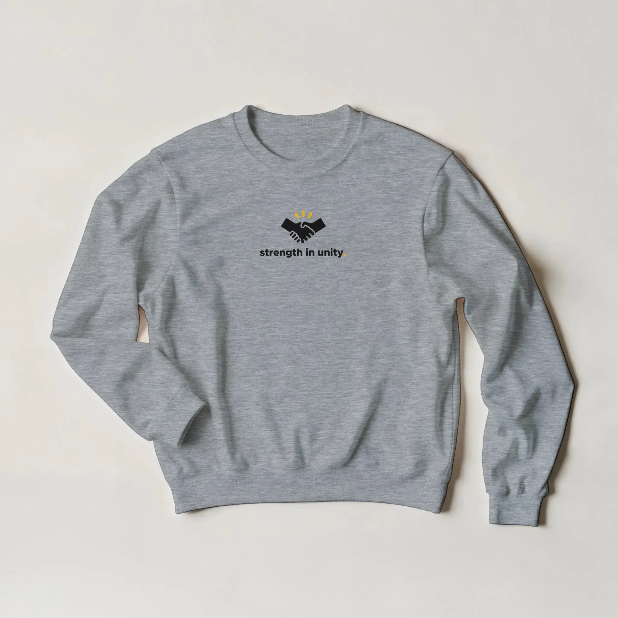 The bold design features a handshake icon and the statement “strength in unity.” to reflect the importance of community and togetherness.