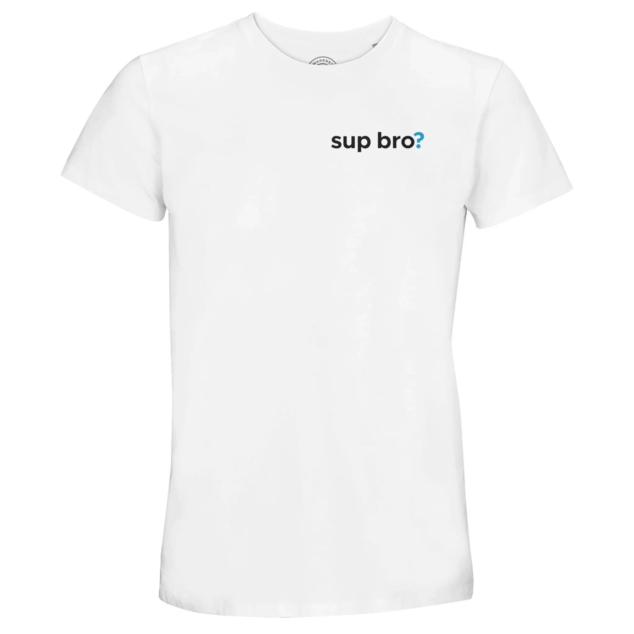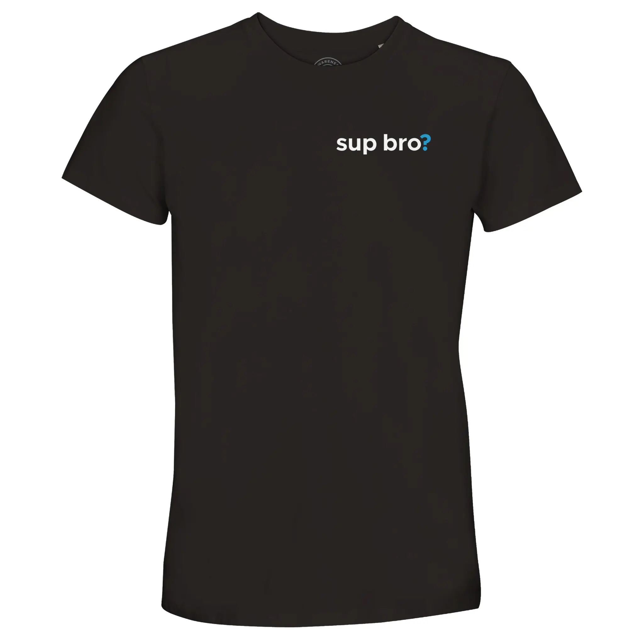 - The Design: Minimal lower-case “sup bro?” typography with the signature blue question mark.