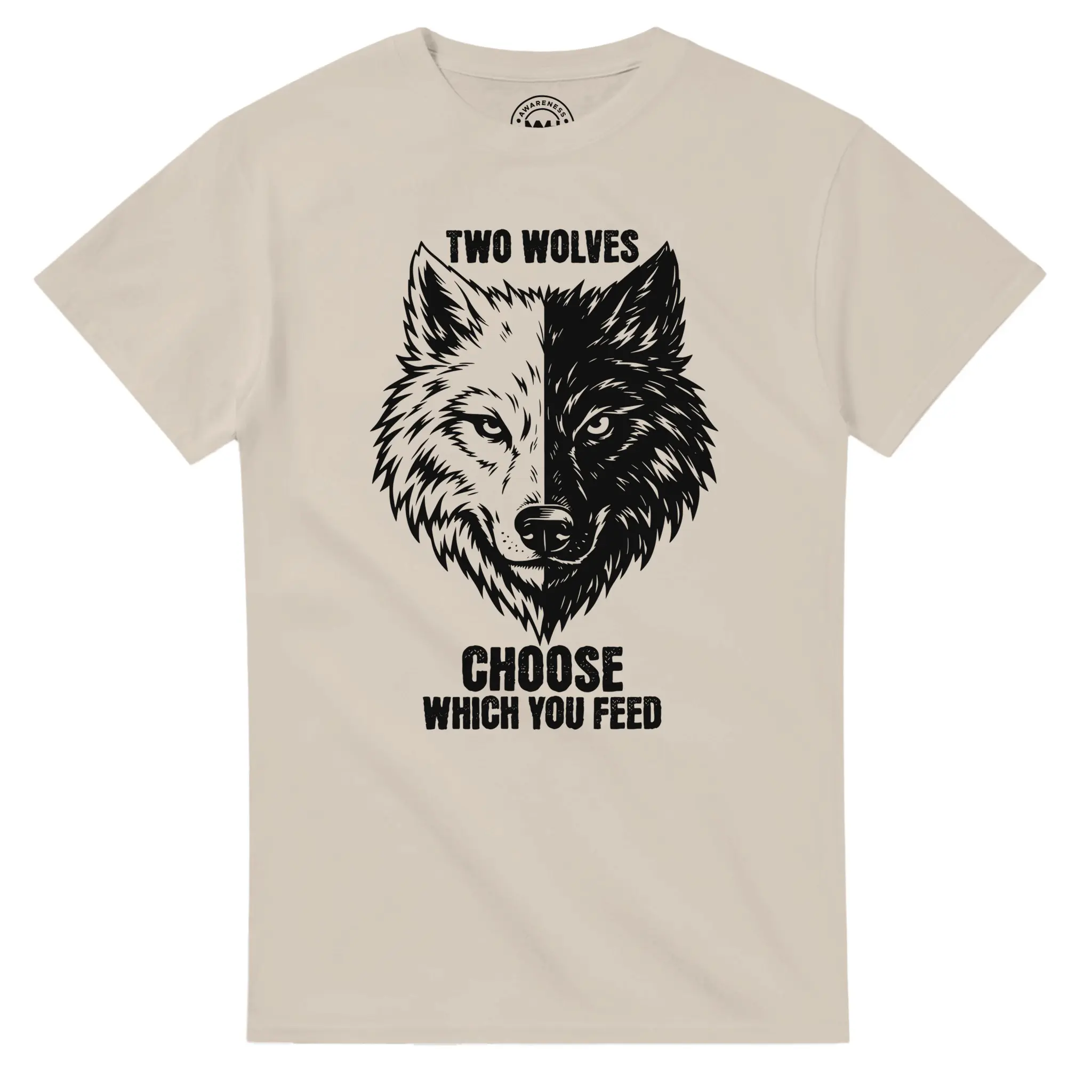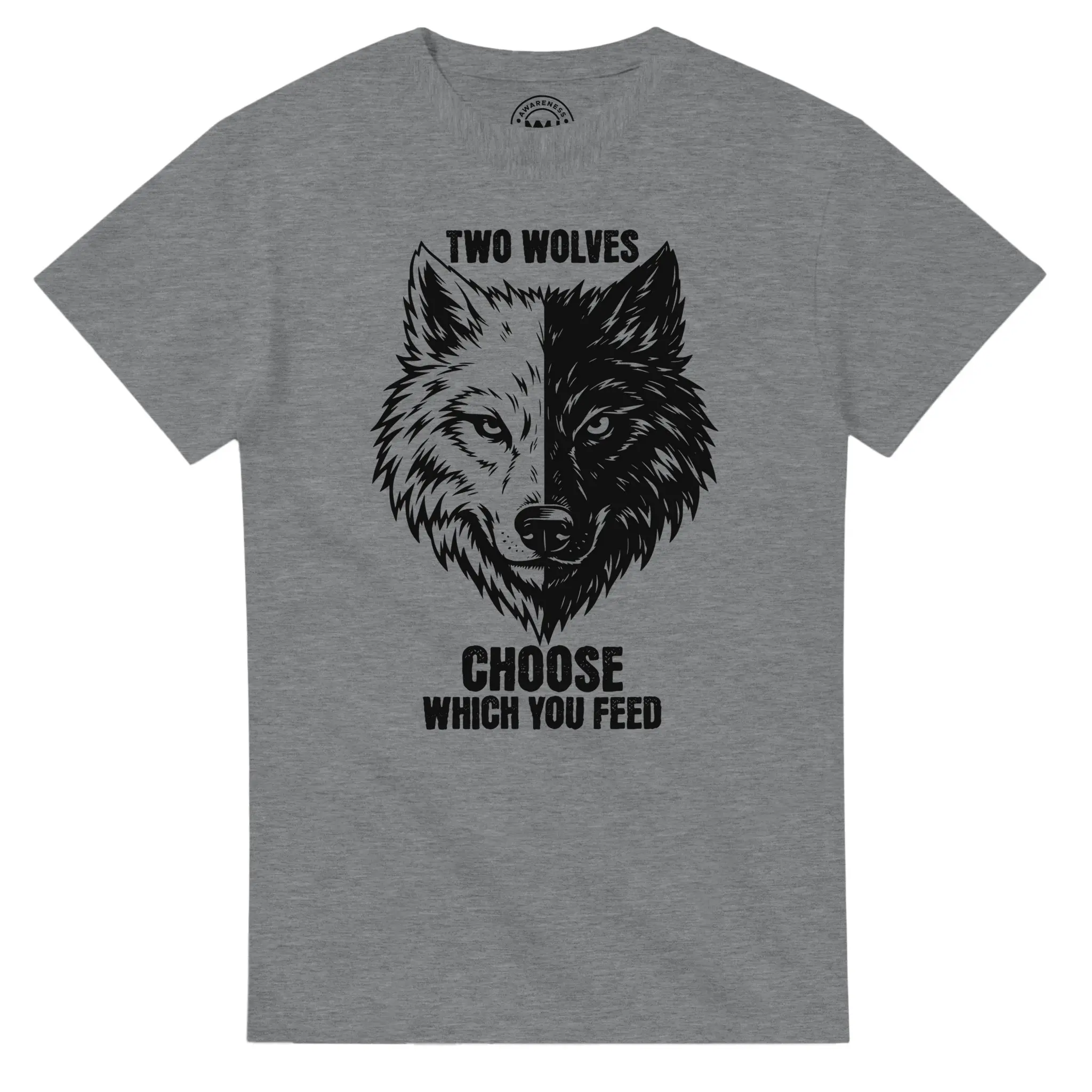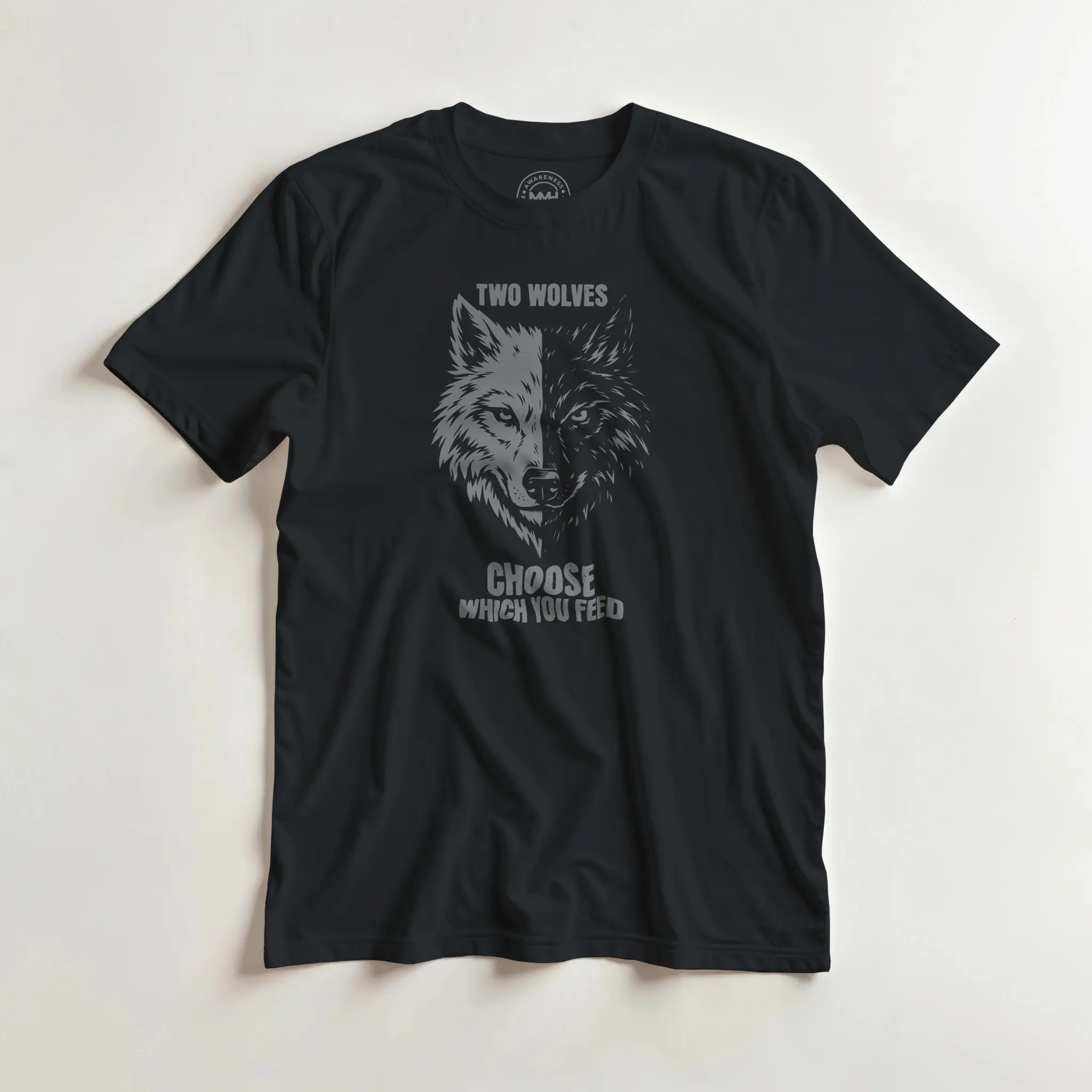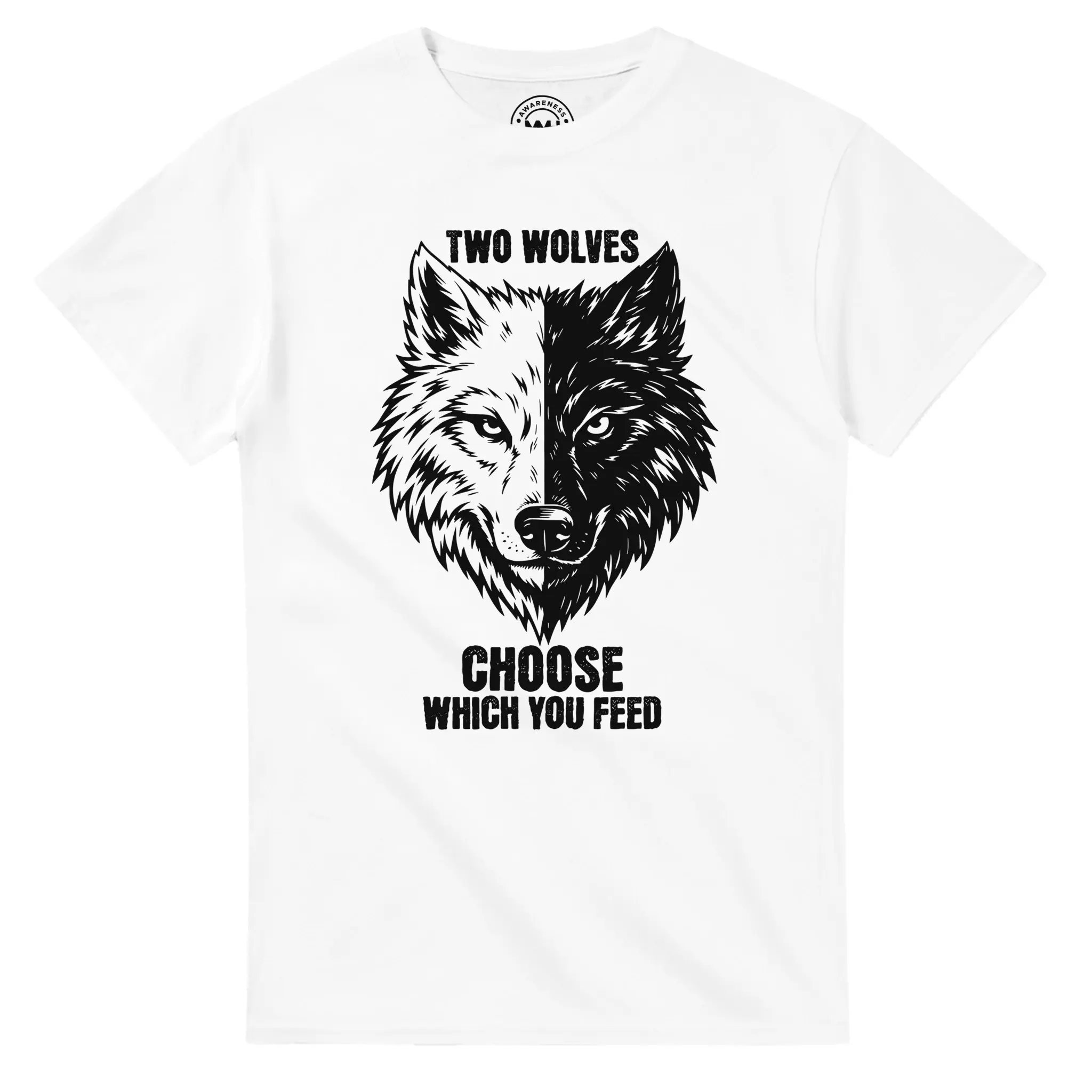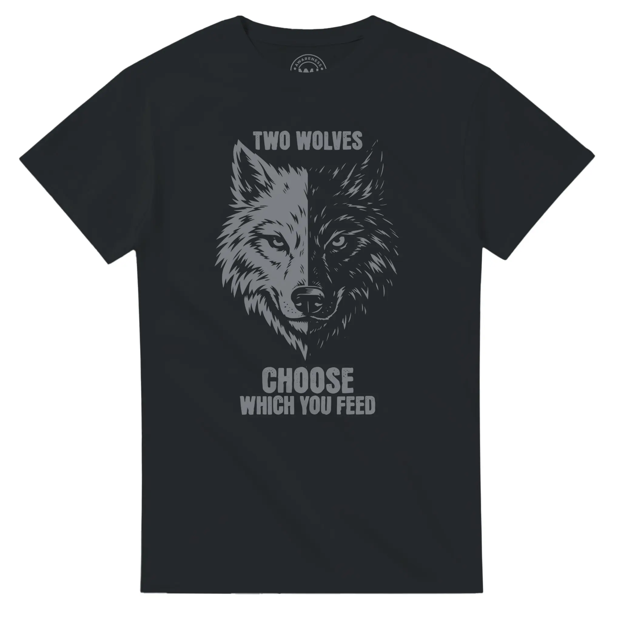 There is a battle going on inside all of us. This classic statement tee features the Two Wolves legend brought to life—a split-face wolf graphic illustrating the conflict between darkness and light, with the timeless reminder: Choose Which You Feed.