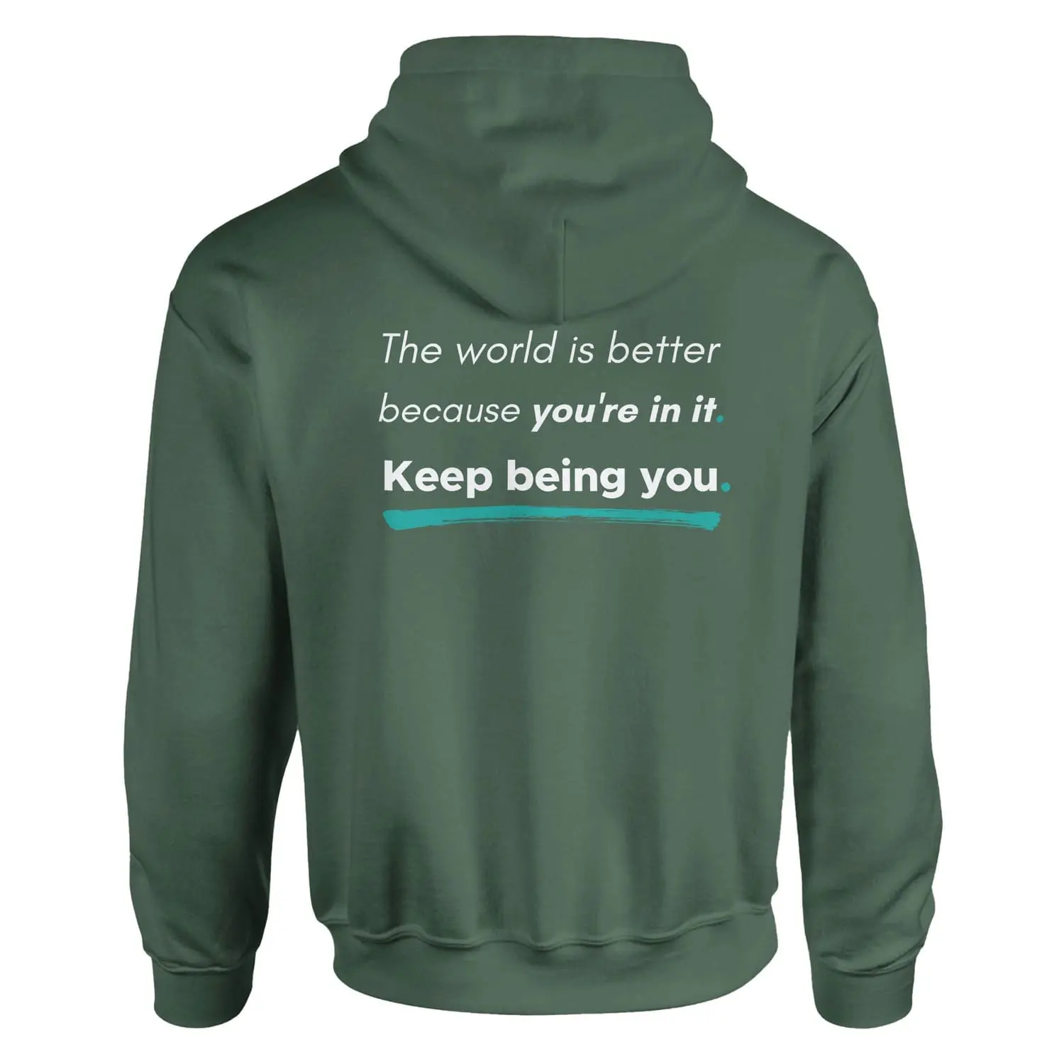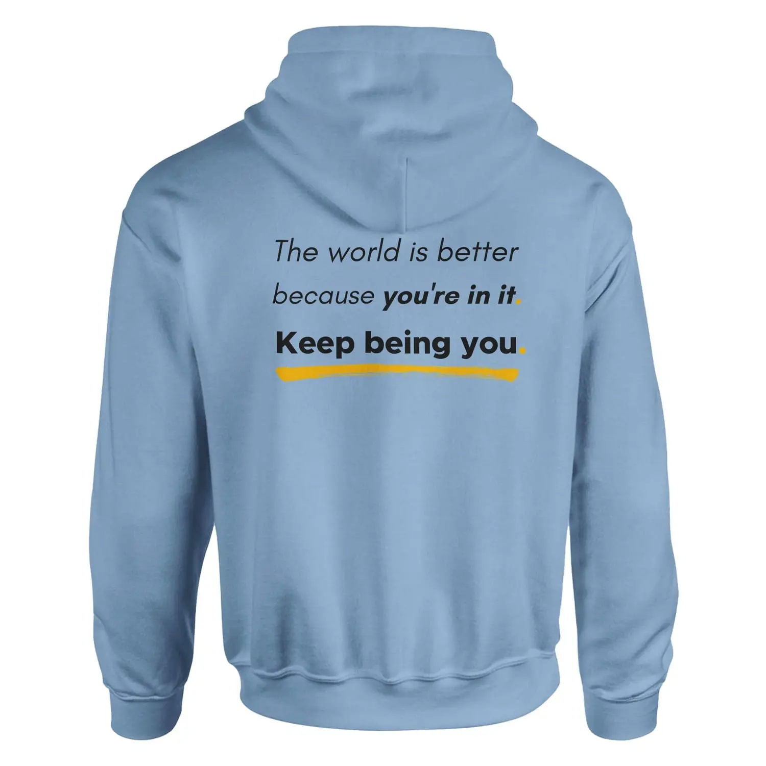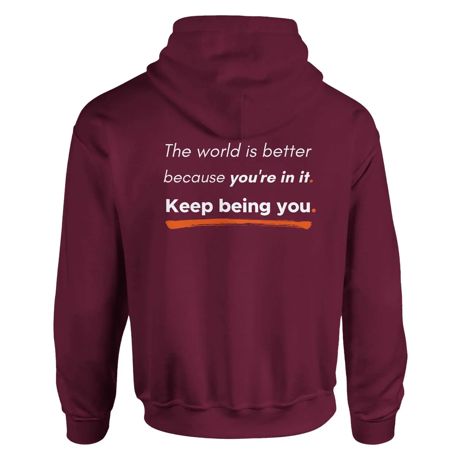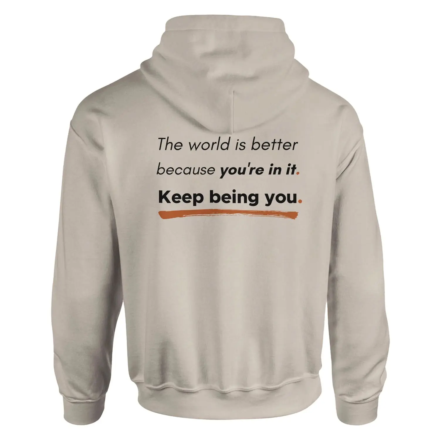 Wear a powerful message of self-acceptance and affirmation with this “You Are Enough” Pullover Hoodie. The reverse positive message reads “The world is better because you’re in it. Keep Being You“