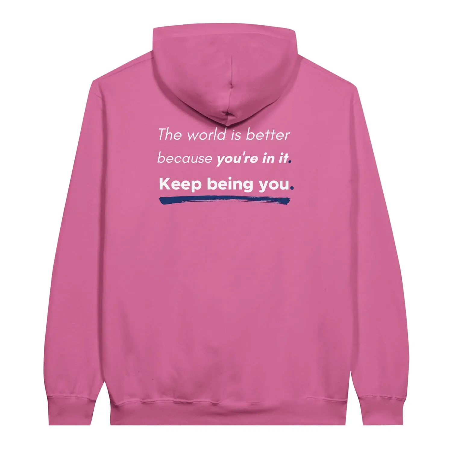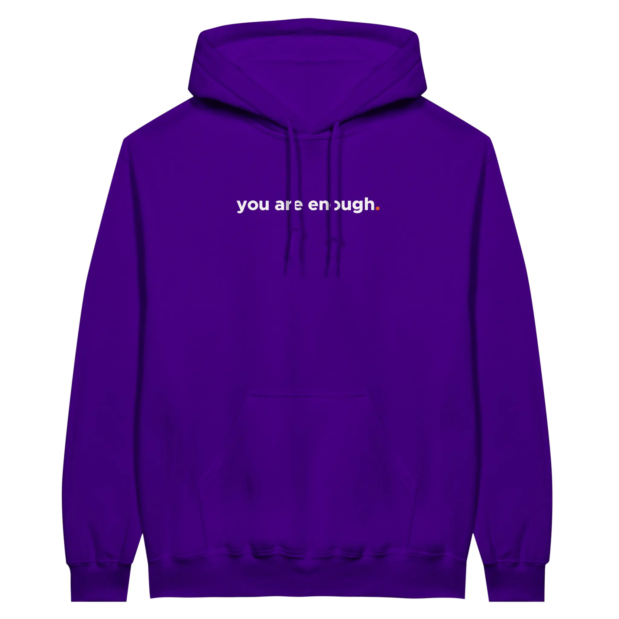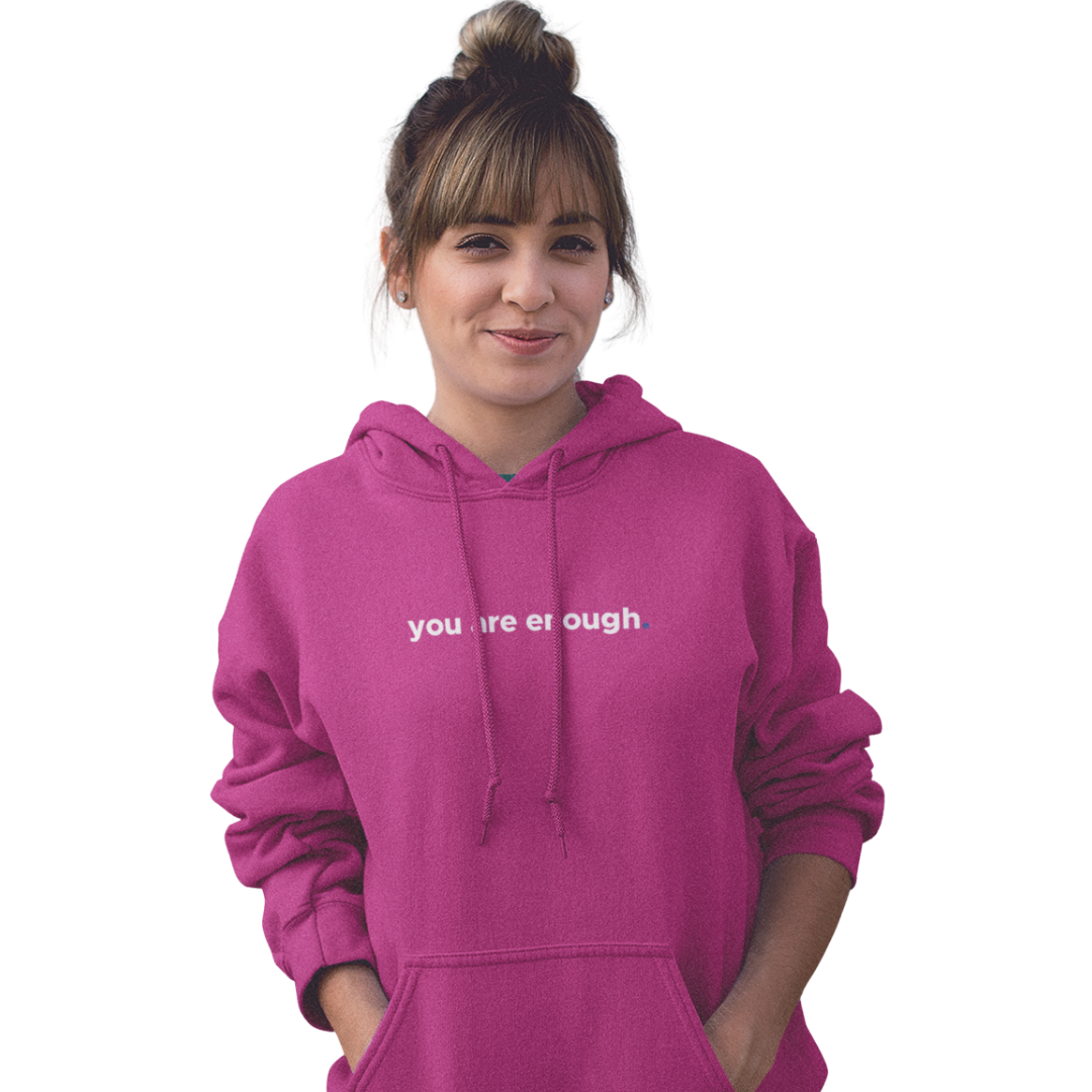 Wear a powerful message of self-acceptance and affirmation with this “You Are Enough” Pullover Hoodie. The reverse positive message reads “The world is better because you’re in it. Keep Being You“