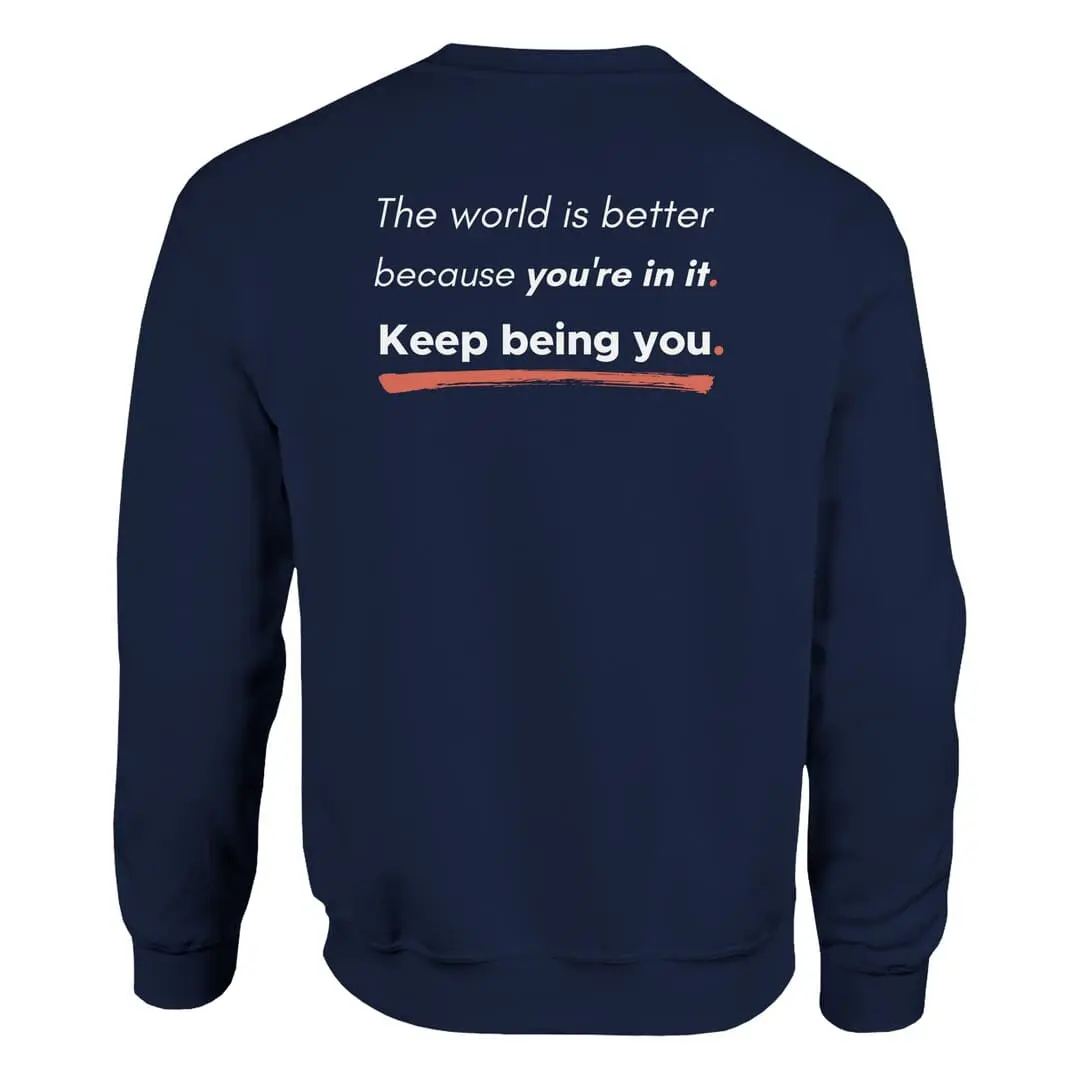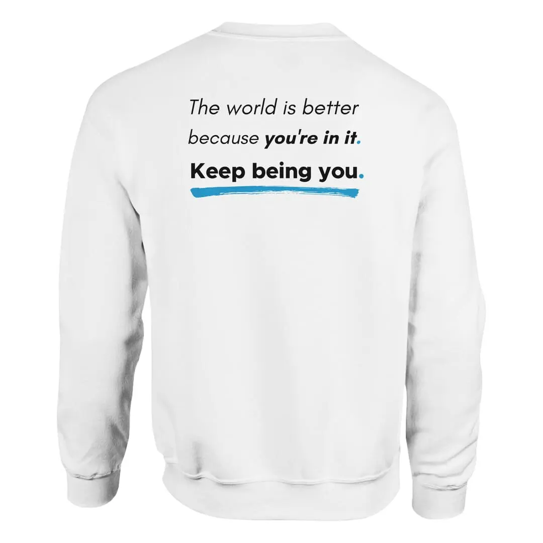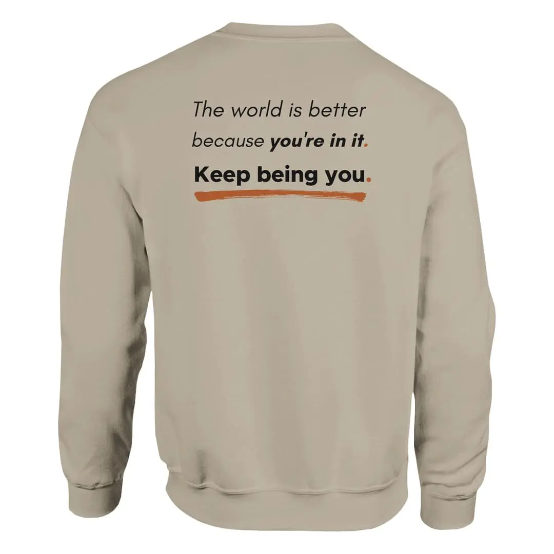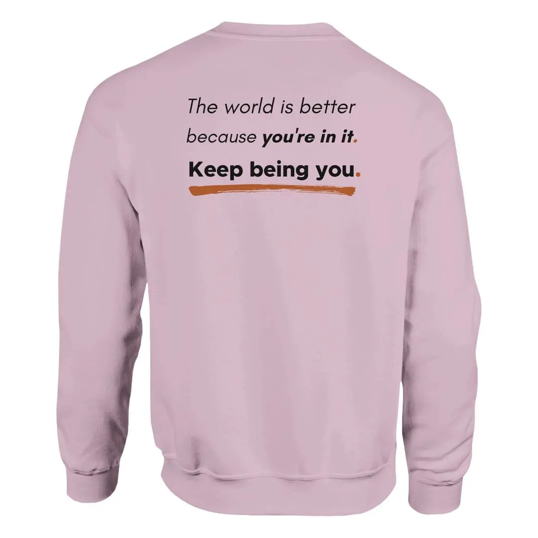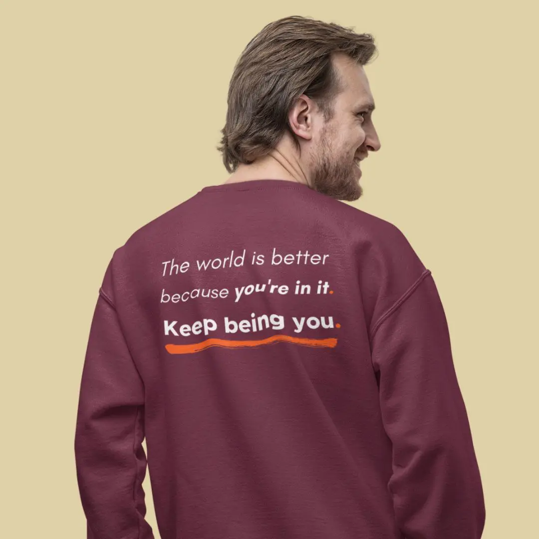 The back reinforces this message with an uplifting affirmation: “The world is better because you’re in it. Keep being you.” Styled with bold and underlined elements, this design stands out as a daily reminder of positivity and self-worth.