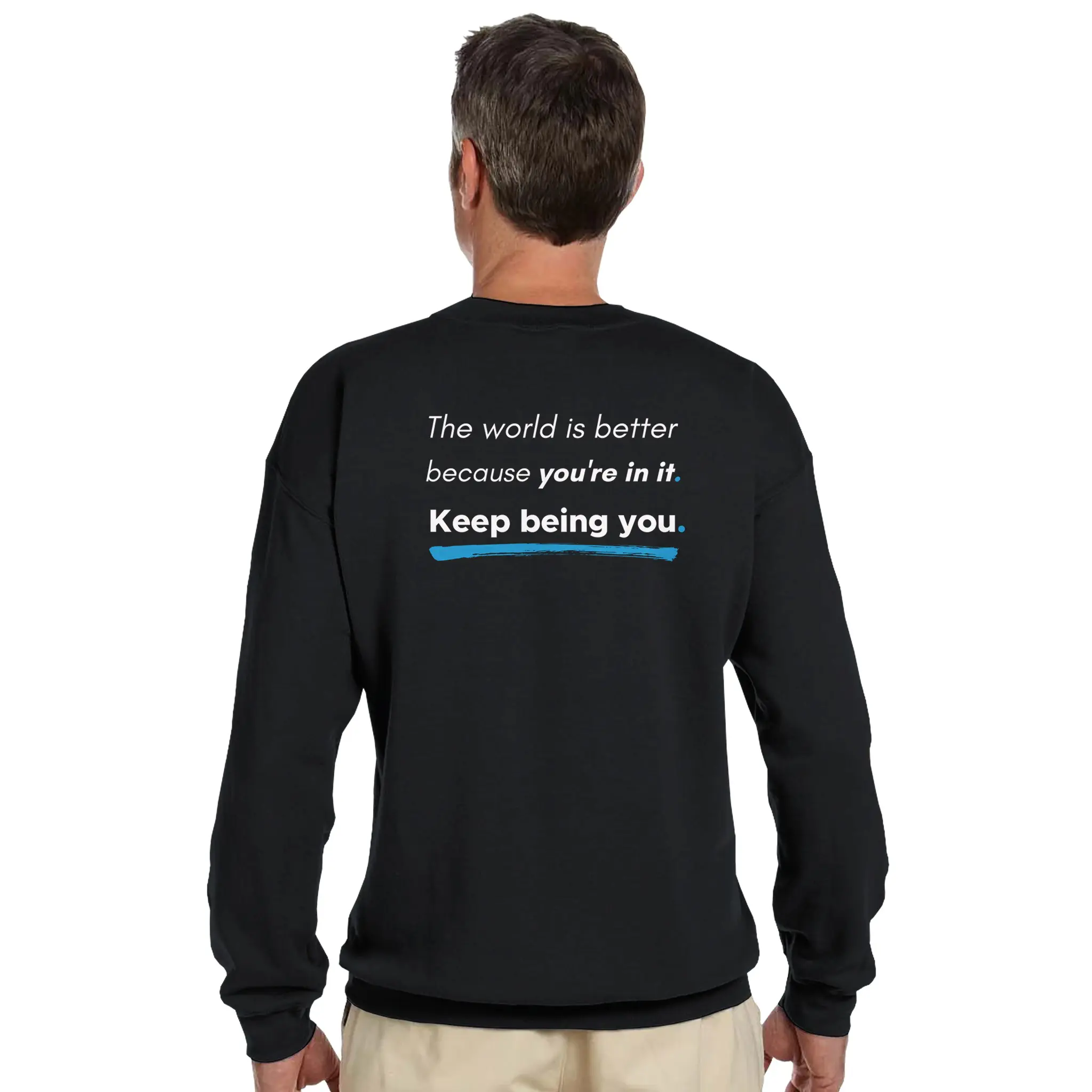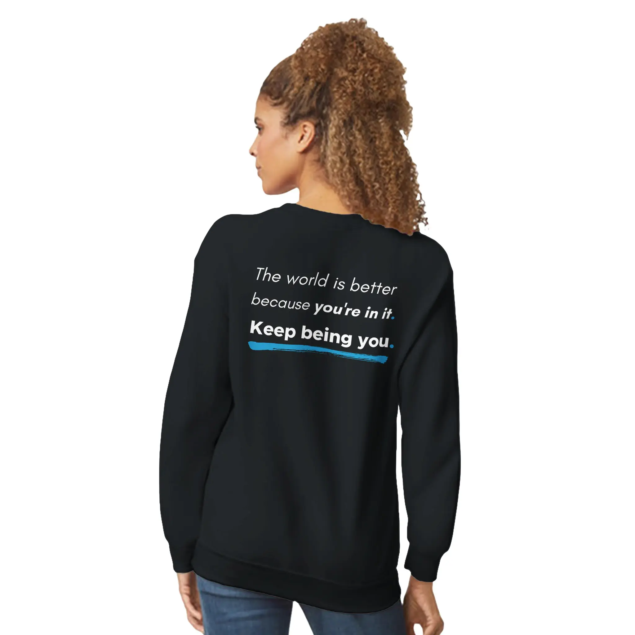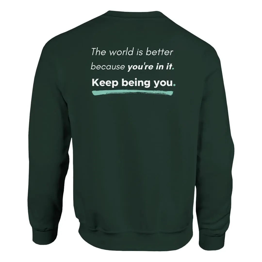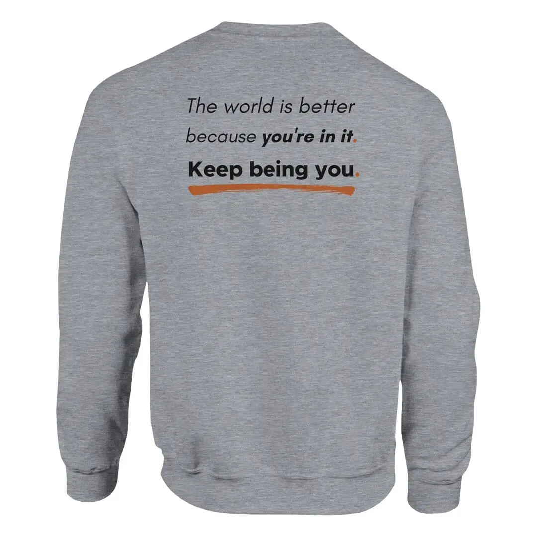 The back reinforces this message with an uplifting affirmation: “The world is better because you’re in it. Keep being you.” Styled with bold and underlined elements, this design stands out as a daily reminder of positivity and self-worth.
