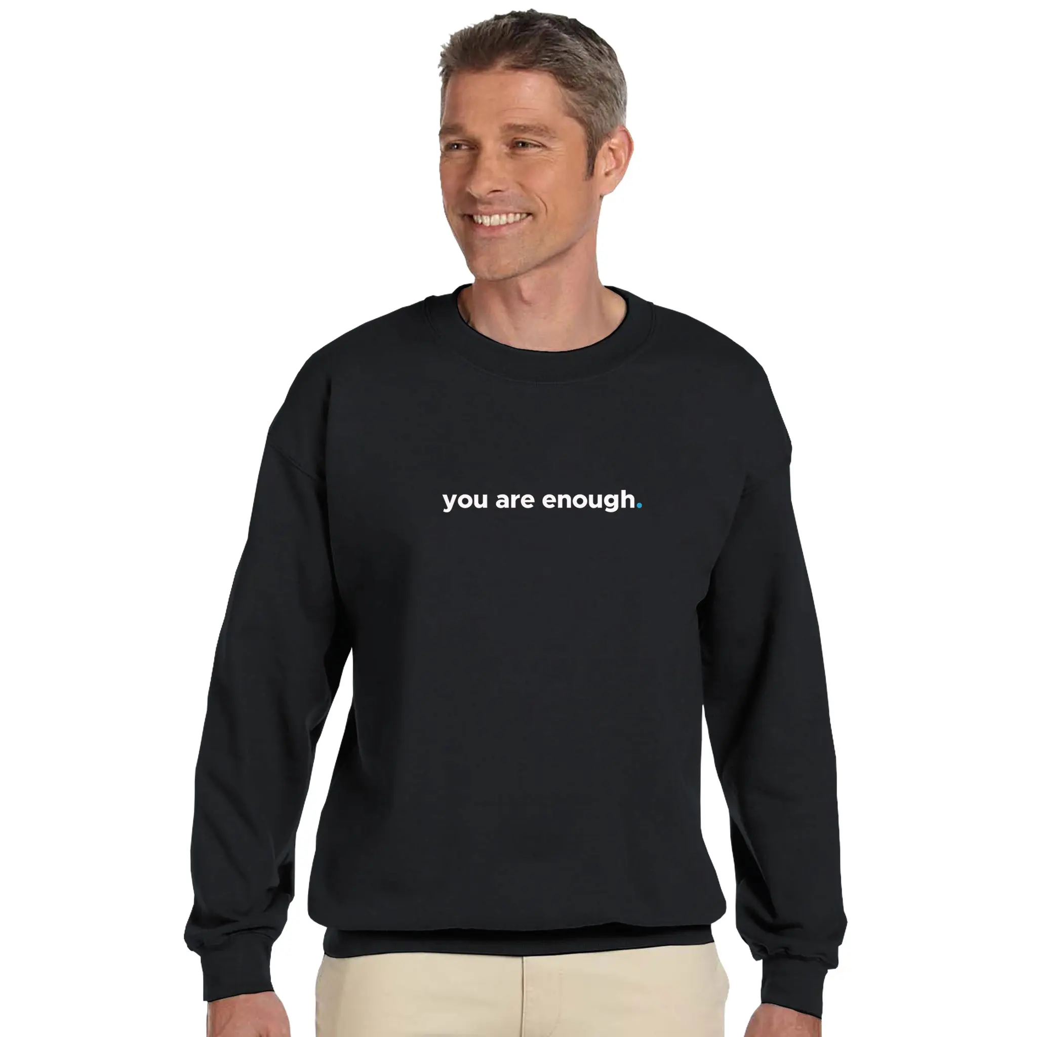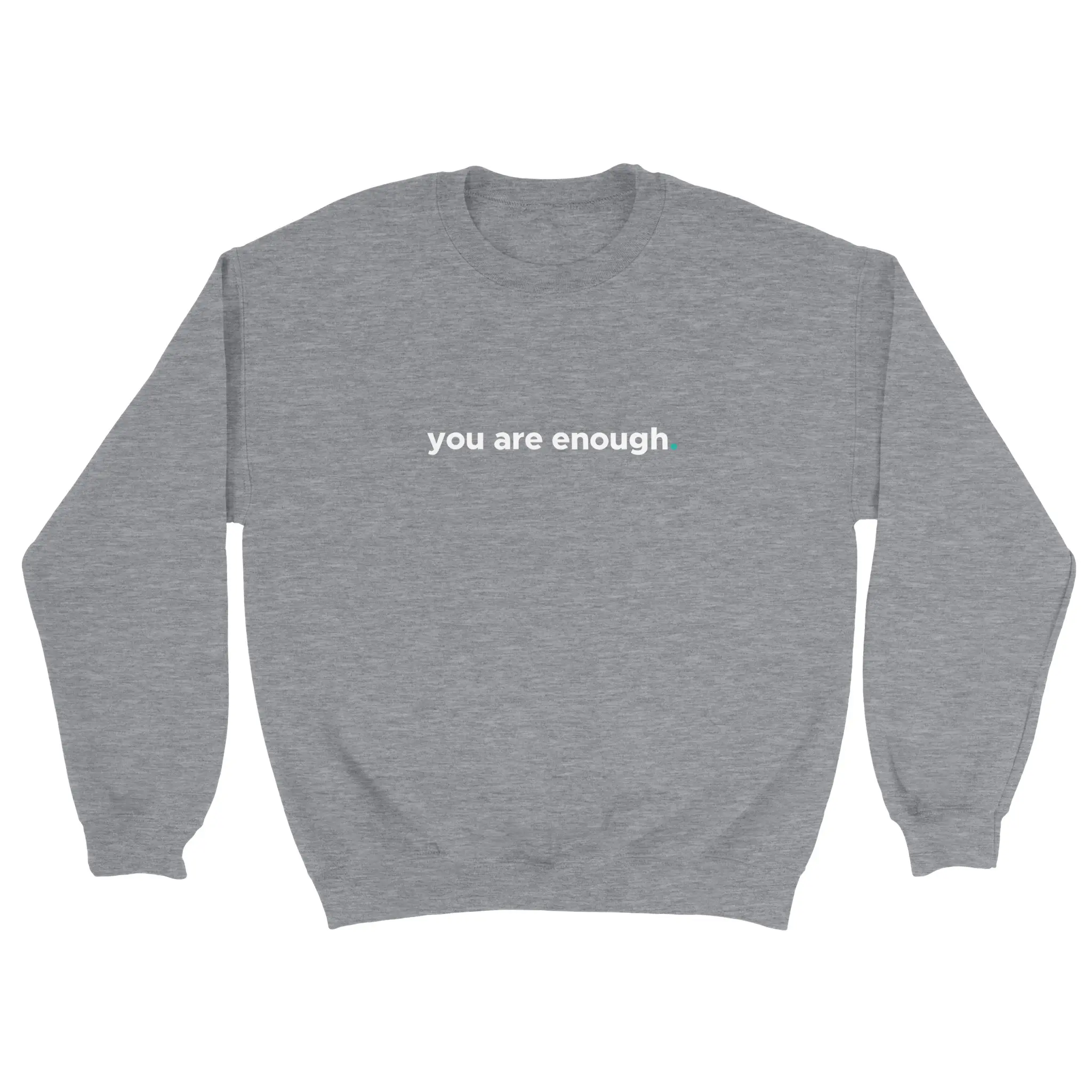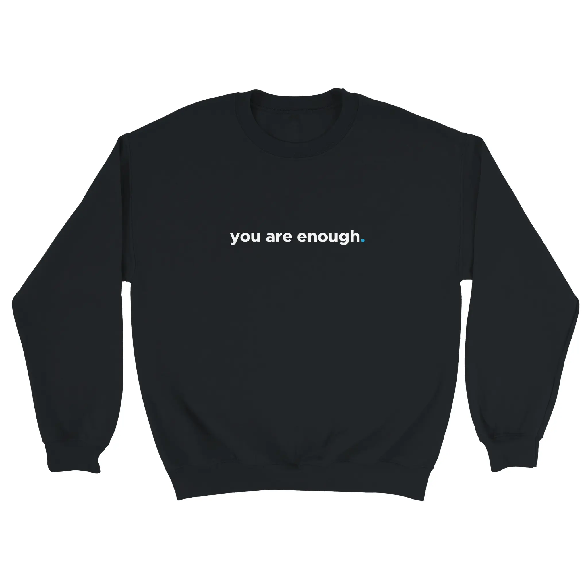 The front of this sweatshirt features the phrase “You Are Enough.” in a minimalist style, with a subtle blue dot for emphasis. A simple yet profound reminder that everyone has value and deserves to be seen, heard, and appreciated.