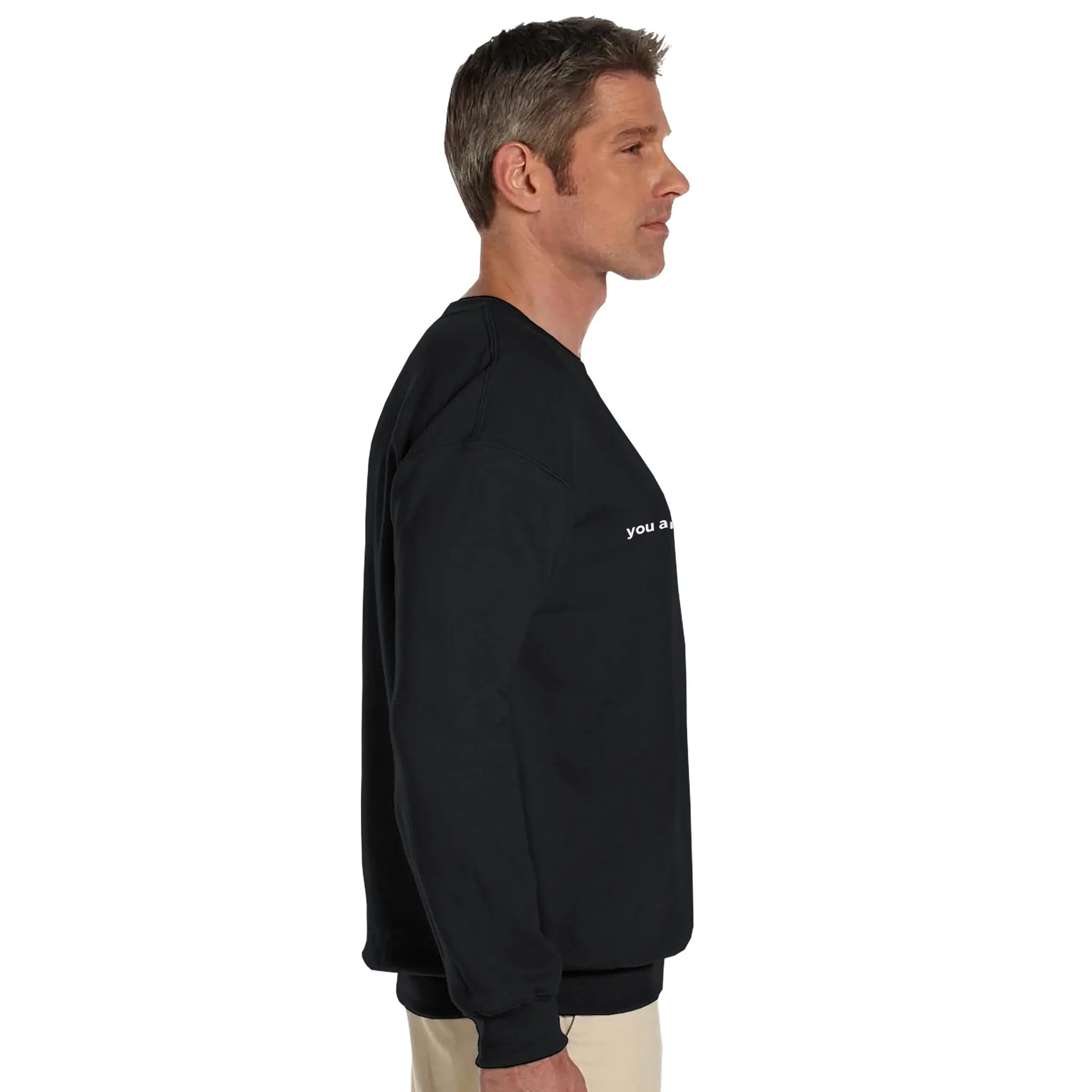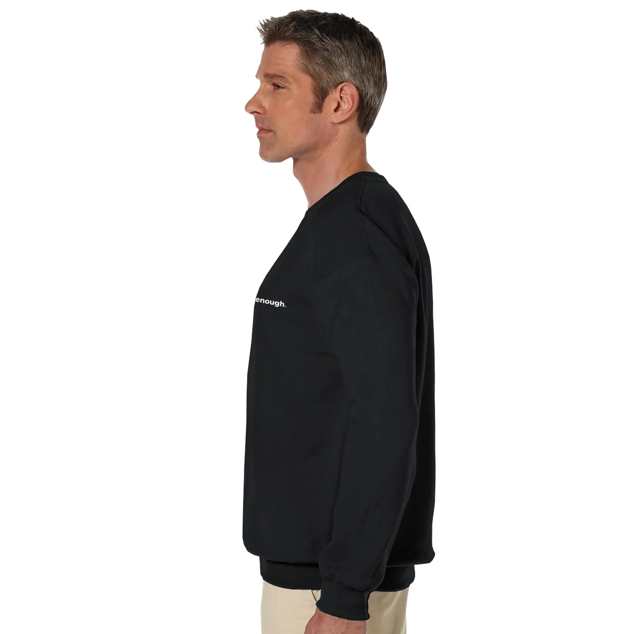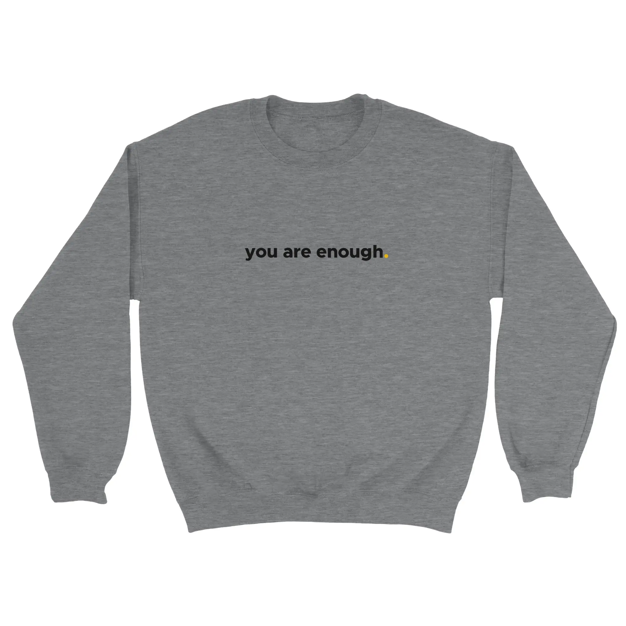 The front of this sweatshirt features the phrase “You Are Enough.” in a minimalist style, with a subtle blue dot for emphasis. A simple yet profound reminder that everyone has value and deserves to be seen, heard, and appreciated.